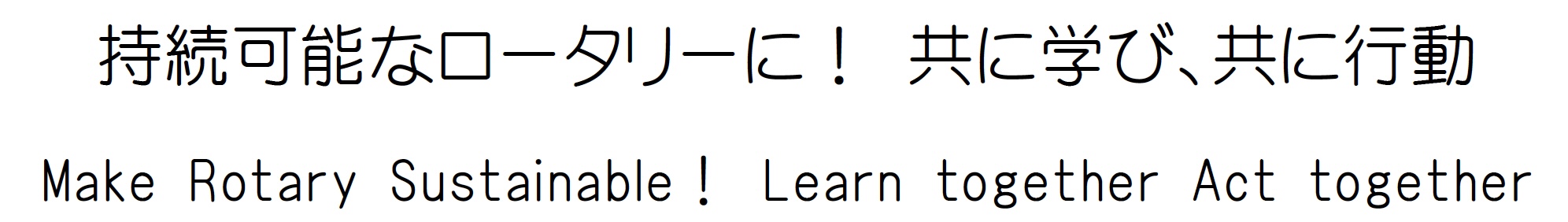 - ロータリー活動は楽しくなければなりません。楽しくないと続きませんし、楽しくないと人にも勧められません。 持続可能なロータリーに! 共に学び、共に行動 Make Rotary Sustainable! Learn together Act together ロータリーの楽しさは何処から来るのでしょう。人によって違いはあるでしょうが、それは参加して有意義と実感できる、知らなかったことを知ることができる、気が付かなかったことに気付かされる、多くの尊敬し得る人を知ることができるからだと思います。 例会は勿論のこと、すべての活動を楽しいものにしていきましょう。
