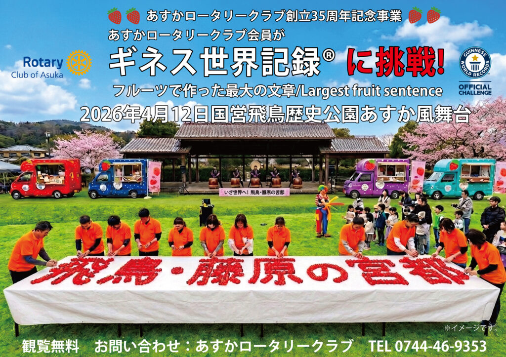 創立35周年の記念事業として、明日香村特産のいちご「あすかルビー」を使ったギネス世界記録への挑戦をはじめ、和太鼓演奏、マジックショー、バルーンアートなど子どもから大人まで楽しめるイベントを実施します。