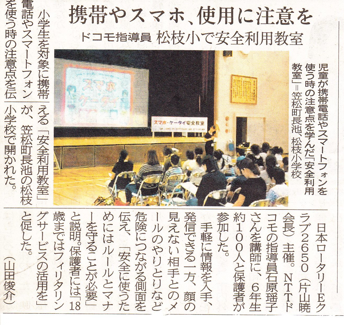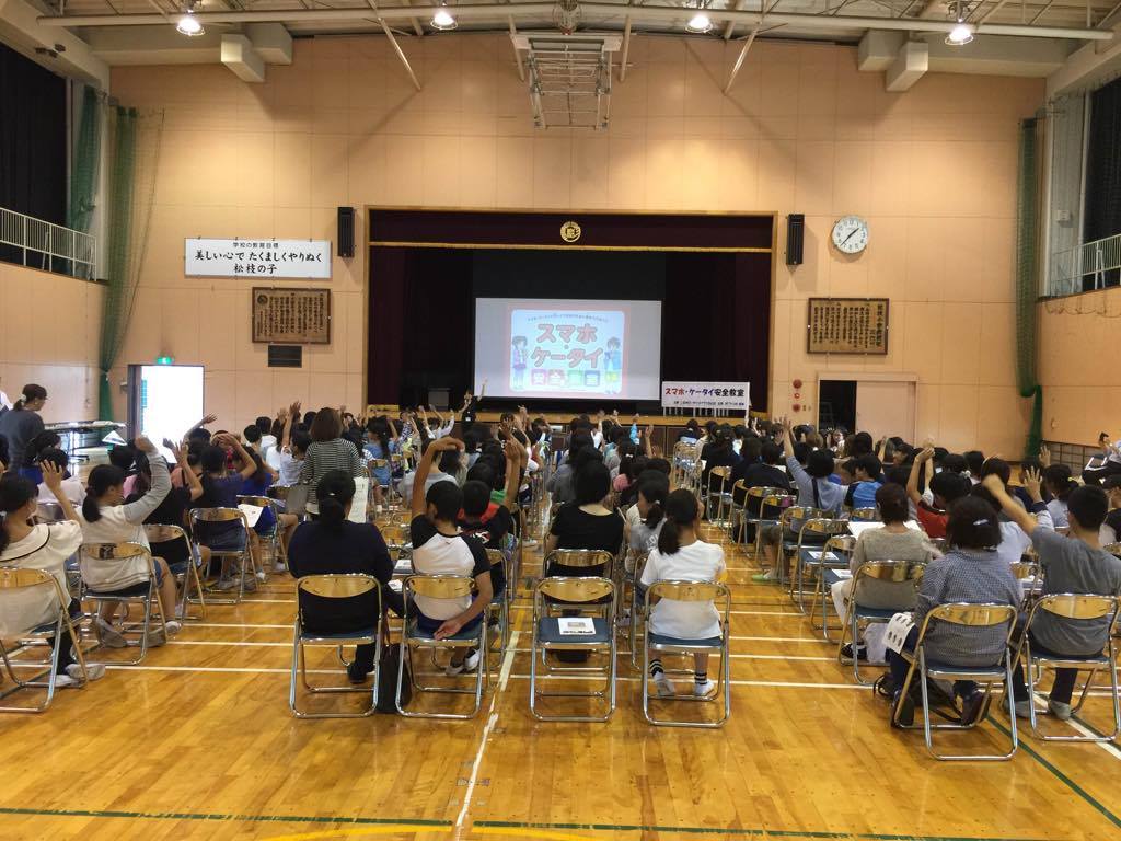 平成28年9月23日(金)岐阜県羽島郡笠松町立松枝小学校にて、今年度第1回目の「スマホ・ケータイ安全教室」を開催いたしました。今回の参加者は、6年生児童102名とその保護者102名と、子どもと大人も一緒に勉強する機会を頂きました。ドコモCS東海の講師の方も、「スマホ・ケータイを購入するのは大人の親です」と、与える側がきちんとルールを決め子どもに渡す大切さを強調されました。スマホ・ケータイのトラブルは年々変化しております。学校と通信キャリアとの橋渡し的な役割ではありますが、この事業の必要性を強く感じました。皆様のご理解とご協力本当にありがとうございました。
