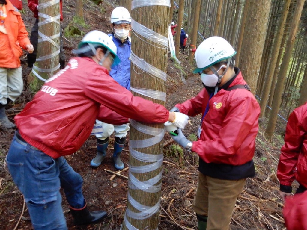 鹿の剝皮害防止の為の※テープ巻作業をしています。※とうもろこしを原料にした生分解性テープ