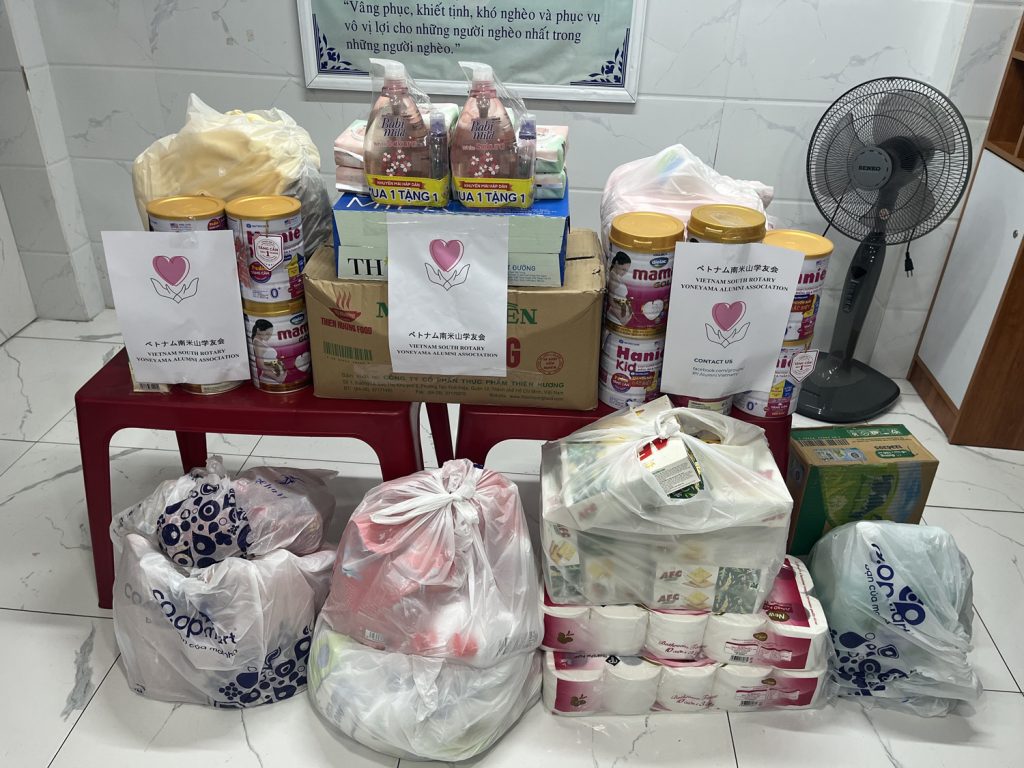 一件目は、カトリック教会が運営されておられる児童養護施設に南学友会のメンバーと訪問し、ミルクやおしめ等の日用品を寄付をしました。