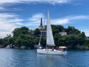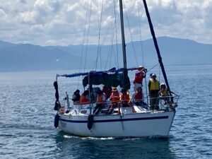 清掃の後は、セーリング体験される50名が4艇に分かれヨットに乗船。多景島に向かいました。一時間後に波止場に到着。上陸してから昼食をとりました。対岸より眺望する彦根の町並みや鈴鹿山系の景色は言葉に出来ない程の綺麗なものでした。島内散策後に彦根港へ帰港。学生たちにの表情は明るく笑い声が聞こえ、みんないい顔をしていました。今回の実施に向けてメンバーや滋賀県立大学、近江高校・彦根セーリング協会の皆様の絶大なる協力があり、無事に終えることができました。