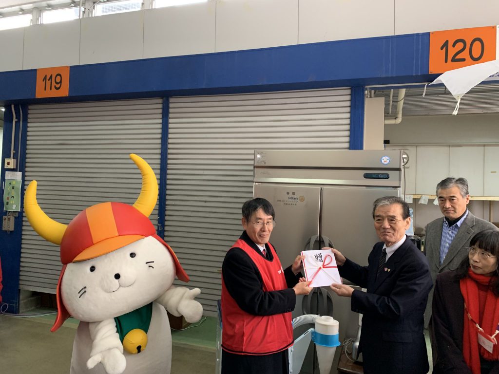 12月9日(日)彦根総合地方卸売市場内フードバンクひこね拠点にて「フードバンク1周年記念行事」が開催されました。最初に彦根ロータリークラブからの寄贈式典が行いました。フードバンク1周年の軌跡をたどるショートムービーの後、彦根ロータリークラブから物品目録寄贈。物品は大型冷蔵庫・精米機・製粉機の各1台です。その際、安居会長から彦根ロータリークラブの社会奉仕活動の紹介をしていただきました。引き続き、彦根社会福祉協議会の園城会長と大久保彦根市長の挨拶、ボランティア活動をされている方々からの感謝のメッセージが読み上げられ寄贈式は終了しました。その後、記念活動として彦根市災害対策品の入れ替えに伴って提供された保存食の無料配布、米粉を使ったお菓子作り体験が行われました。