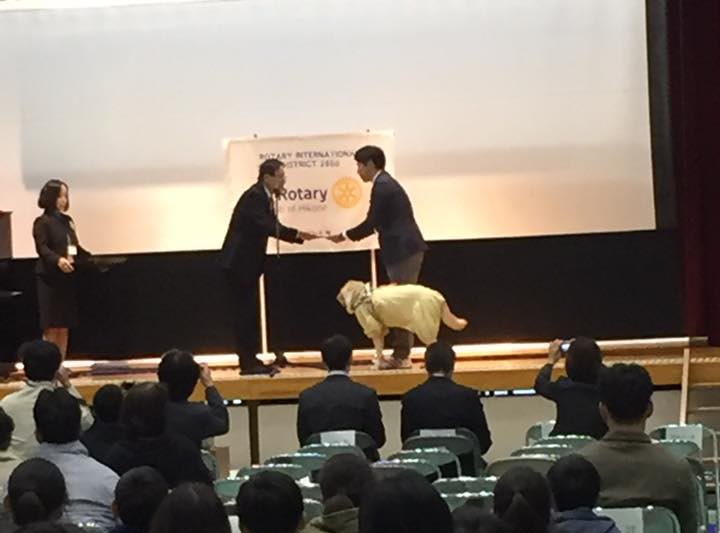 続いて関西盲導犬協会の岡本講師とブライト号に活動支援金を贈呈し、お返しに感謝状を頂いた後、活動のご紹介をしていただきました。演奏会では、盲学校音楽部と彦根エコーオーケストラによる生の演奏を皆さんに楽しんでいただきました。