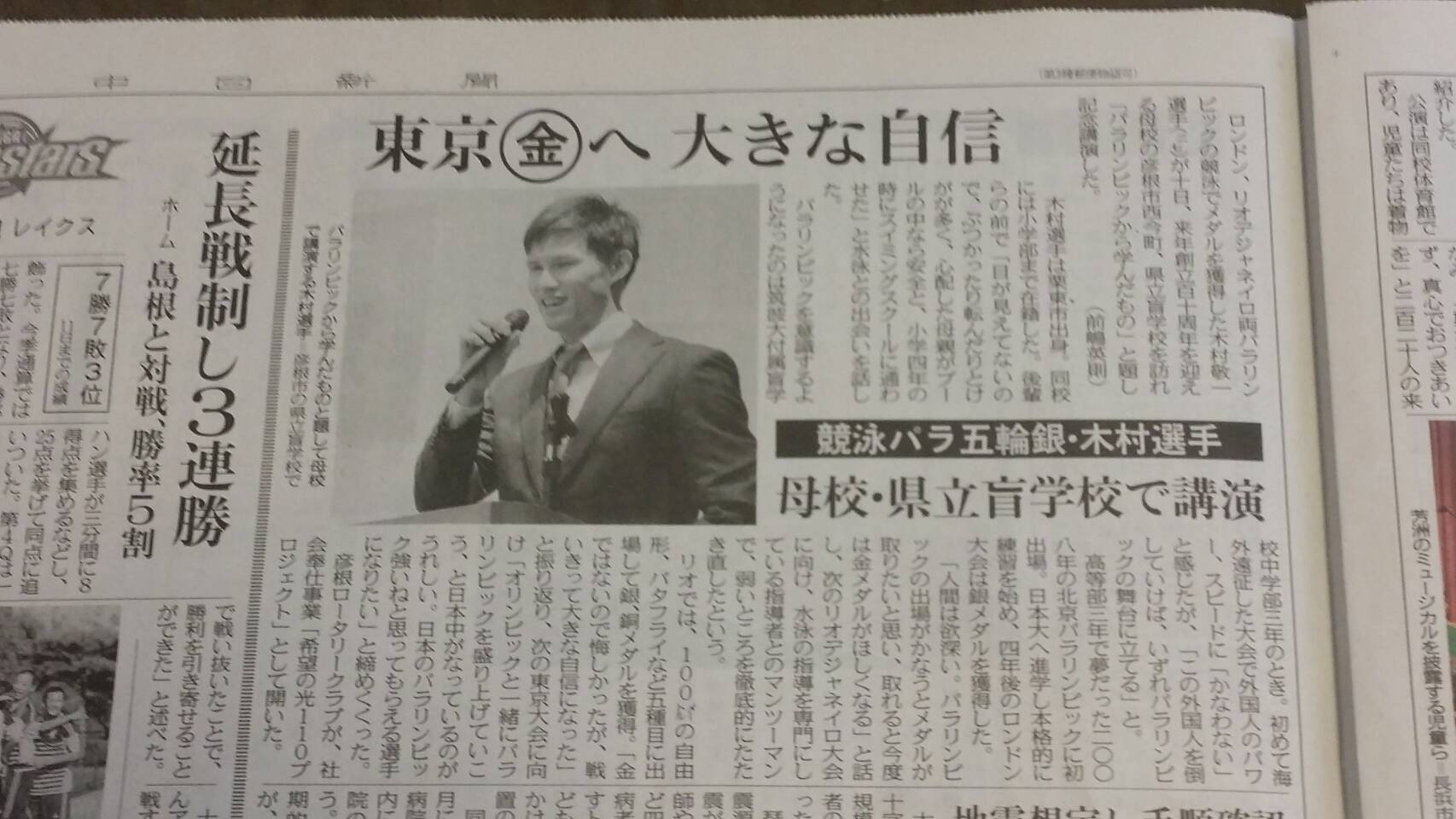 小椋会長の挨拶に始まり、記念品贈呈として拡大読書器を贈らせていただきました。記念講演では盲学校出身でパラリンピック・メダリストの木村敬一選手(水泳)による「パラリンピックから学んだもの」と題した講演で、ご本人の生い立ちからロンドン・リオでのメダル獲得まで、そして次の東京への抱負を通して「やりきること」の大切さを熱く語っていただきました。