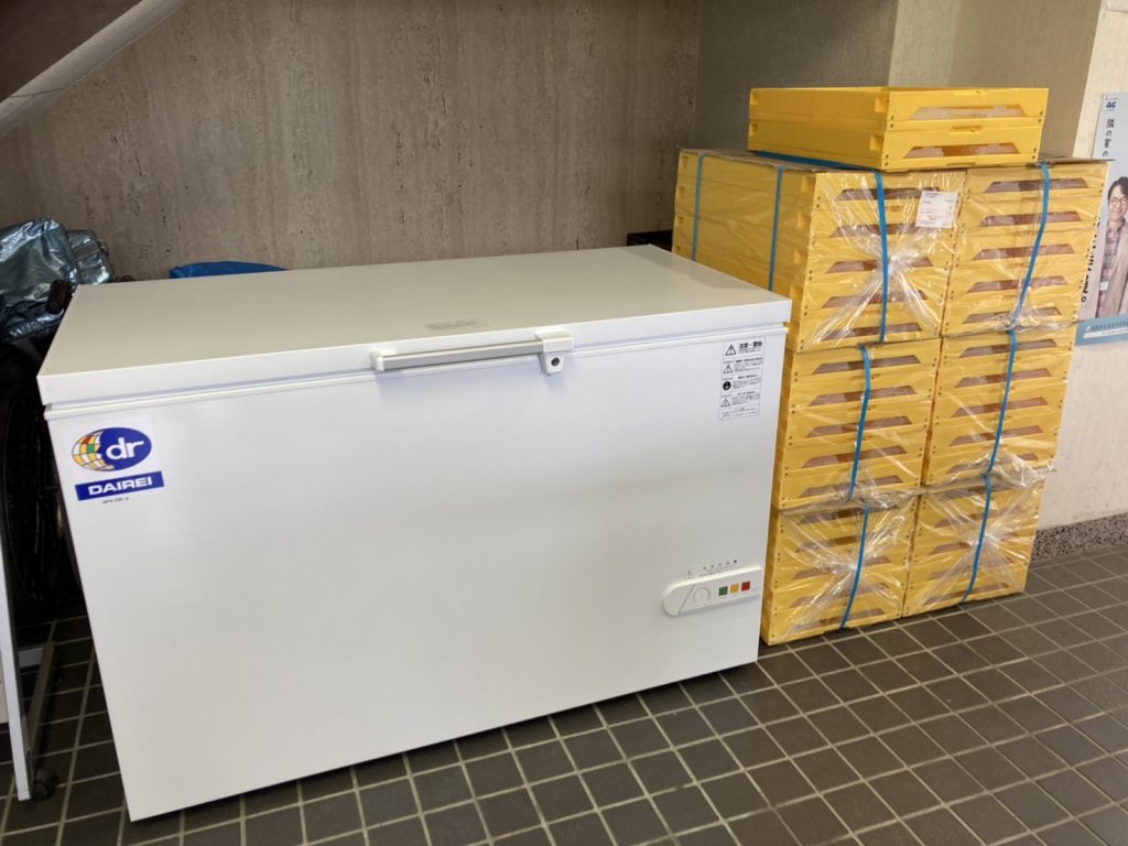 冷蔵庫1台、エコバッグ280枚、折り畳み式コンテナ50個を寄贈しました。
