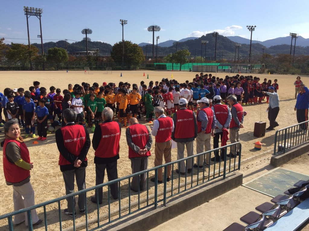 10月12日体育の日、この日は彦根市の至る所で「彦根元気フェスタ」という体育の日のイベントでスポーツ行事が開催さ れました。我々彦根ロータリークラブも、彦根金亀公園多目的広場にて、彦根市サッカー協会の少年サッカーチーム10 チームと一般参加者数名の合計約130名でサッカー教室を開催いたしました。爽やかな秋晴れのもと少し汗ばむ位の最高のスポーツ日和で、京都サンガFCの育成・普及部のコーチ3名 に来て頂き、サッカーの技術指導と試合の実践指導を2時間半にわたり丁寧にご指導いただきました。 開会式では、杉本会長がこの大会の趣旨を説明され、サッカーを通しての健全な育成を願われました。また、10月31日 のロータリー杯少年サッカー大会では、今日の練習を生かして優勝目指して頑張ってほしいと締められました。 その後、京都サンガFCのコーチより、サッカーの準備から一つずつ細かく指導され、みんなが笑顔で楽しいサッカー教 室を体験しました。普段会うことのないプロチームの指導ということで始めは緊張した面持ちでしたが、すぐにサッカーの楽 しさに溶け込んで行ったように見えました。最後に、1日のまとめとして少人数ににる練習試合が行われ、それぞれ自分の 力を思い存分に発揮して、一緒に来られているご家族や、コーチにアピールしていました。 閉会式には、京都サンガFCのコーチより、少年たちにサッカーに対する熱い思いを伝え、将来の日本代表を目指して頑 張って下さいと激励されました。そして、今サッカーが出来る喜びと感謝を忘れずにこれからも頑張ってほしいと伝えられ サッカー教室は終了しました。 彦根ロータリークラブとして、青少年の育成、地域の振興に一躍担っているという充実感を感じた一日でした。