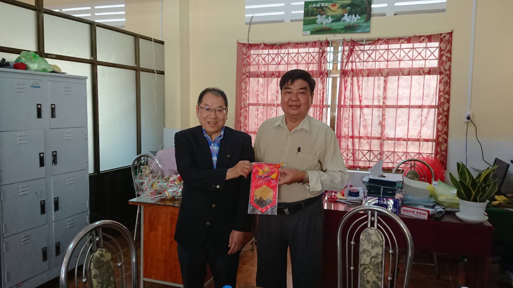 2019年11月25日(月)8時30分より、ベトナム国ソクチャン省AN LAC THON 1 小学校にて「カロム贈呈式」が開催されました。小学校からは校長先生、省から教育部門の代表、彦根RCから本庄会長、本登、青木、松田、小田柿の5名と米山奨学生バオ君が参加しました。「AN LAC THON 1 小学校は、1975年開校、規模は生徒800人(1年生から5年生)、教師43人、クラス数20の学校です。贈呈式には5年生(180人)が学校を代表して臨席されました。式では、校長先生の挨拶、彦根RC本庄会長の挨拶、米山奨学生バオ君の自己紹介、彦根市長からのメッセージの紹介、子供たち代表によるダンスや歌での歓迎、学校で良く行われる行事の紹介として綱引きやライム運び競争などのデモンストレーションが順次行われました。途中から他の学年も交流しとても多くの小学生の見守る中の式典となりました。