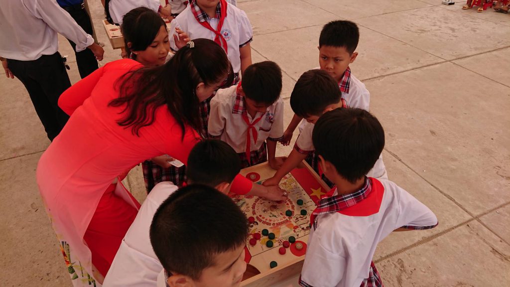 引き続き、今回手持ちした6台のカロムを披露、カロムの遊び方を説明し、子供たちが順番にカロム遊びの体験を行いました。ルールブックと少しの説明でしたが、子供たちは遊び方の吞み込みが早く、皆がカロム遊びをとても楽しんでいました。また、同時並行で、スカイプ(インターネットを通じての動画通話)を利用して、彦根市立城東小学校の子供たちとベトナムの子供たちが、いろいろな質問を投げ合って国際交流を行いました。ベトナムでは、取り分け子供たちの歓迎ぶりは顕著で、彦根RCのメンバーはサイン攻めにあい皆が大汗をかきながらその要望に応えていました。式典は11時に終了し、ベトナム現地での大役を果たした彦根RC参加者はほっと胸をなでおろすことが出来ました。尚、全日程の中で、バオ君は通訳としての役割でなく、小学校との予定調整などを行い大きな活躍をされました。今回の訪越は、23日(土)日本からベトナム・ハノイへ移動、24日(日)ベトナム・ハノイからカントー(ベトナム南部の都市)へ移動、25日(月)カントーからソクチャンの小学校移動後に式典、カントーからハノイへ移動、26日(火)ハノイから帰国という日程でした。