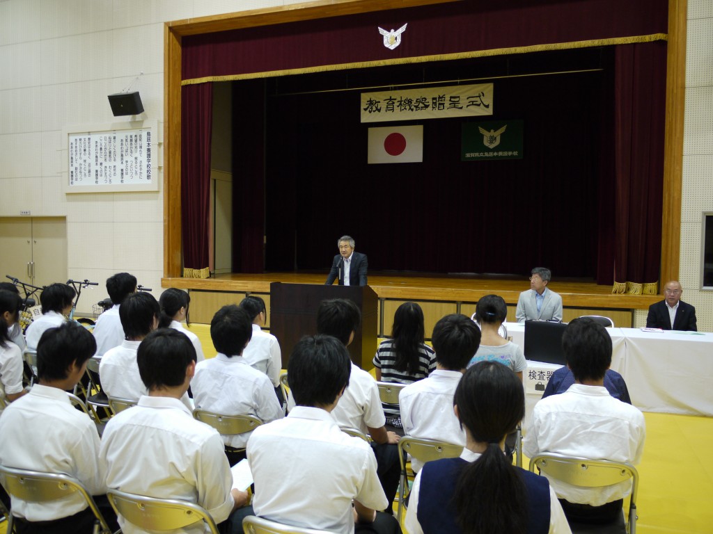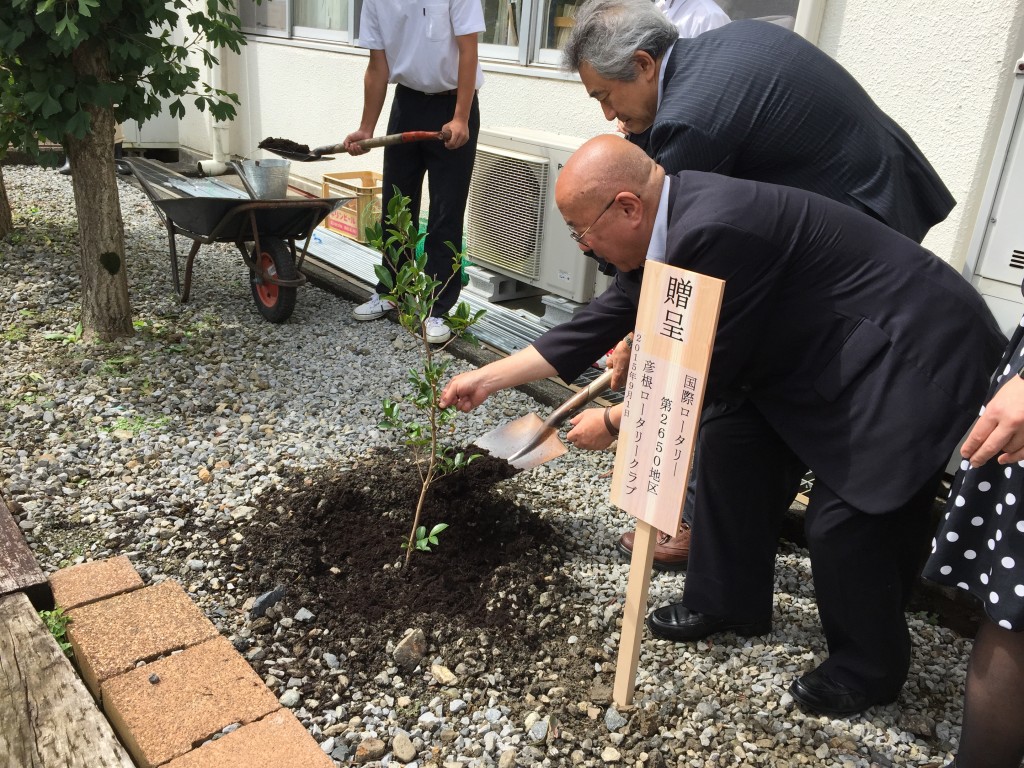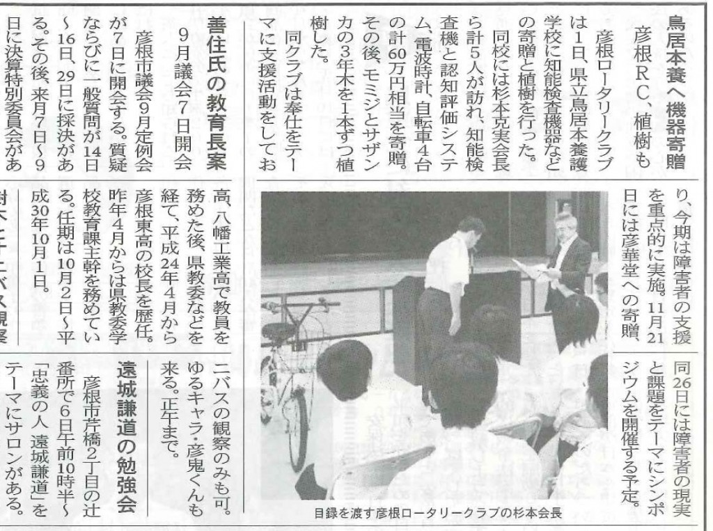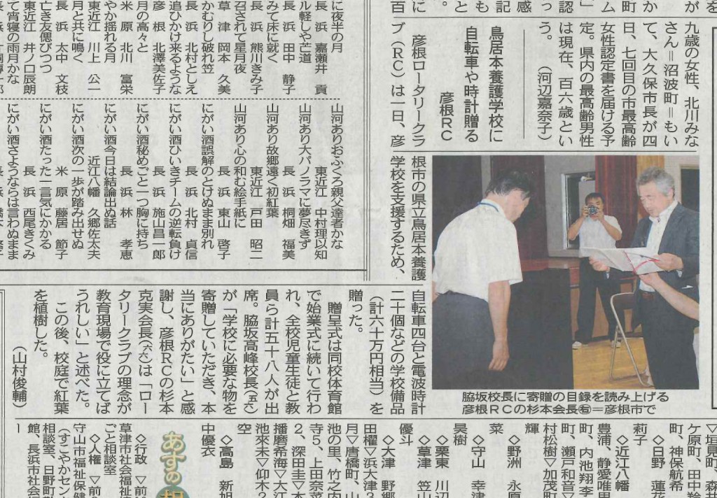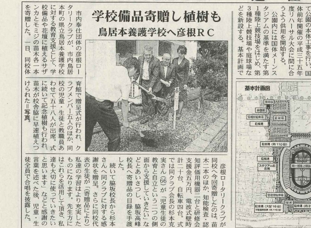 プロジェクト「明るく楽しく共に生きる社会をつくる障害者自立支援」として、滋賀県立鳥居本養護学校への教育支援を実施しました。滋賀県立鳥居本養護学校は、継続して療養及び生活規制を必要とする児童生徒を教育の対象とし病弱の養護学校であります。養護支援は、重度障害が優先となり、支援の手も遅れていると察しております。彦根ロータリークラブは、それらの理解を深め交流を図り、教育支援を実施するにあたり、 児童・生徒と協力し校内の花壇整備の一環として山茶花・紅葉の植樹を行います。また、知能検査・認知評価システム等の検査機器、および学校備品の寄贈を行いました。2015年9月1日(火)に贈呈式と植樹式を開催しました。