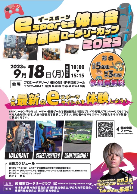 「eスポーツ」は2022年のアジア競技大会で正式種目となり、2025年当地彦根で行われる国民スポーツ大会でも採用の可能性が高く、年齢、性別、体格差、障がいの有無や地域に関係なくみんなが楽しく参加できるダイバーシティなスポーツです。彦根市教育委員会をはじめとした地域の教育委員会の後援をいただき、学校にチラシ配布(40校5機関、8000枚)しひとりでも多くの子供達が、これからのデジタル社会の新しいスポーツを体験してもらうように広報を行いました。