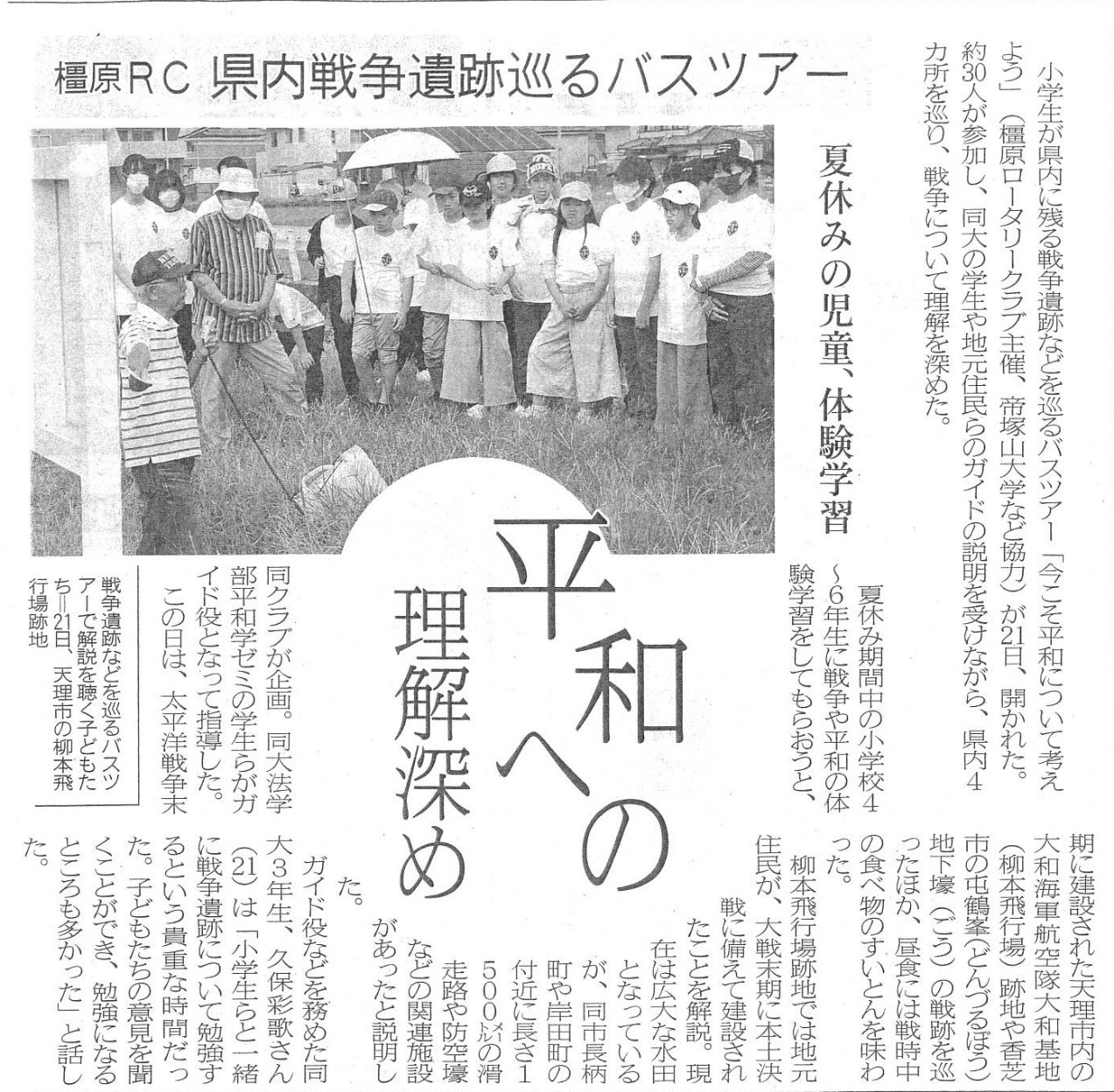 実施場所:①天理市 柳本飛行場跡、②航空自衛隊奈良基地 職場見学、③昼食 戦時中のお食事体験、④屯鶴峯 地下壕、 ⑤奈良県社会福祉総合センター