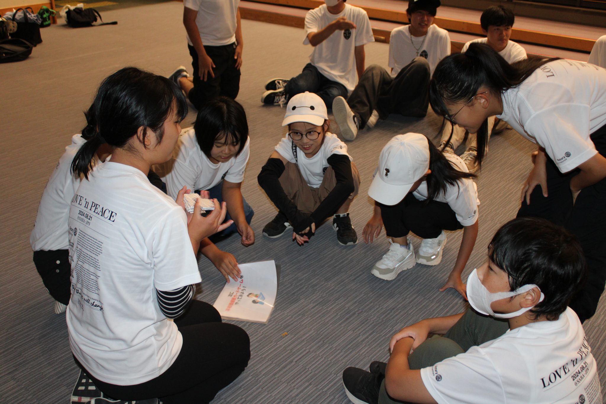 最後には、一日のまとめとして奈良県社会福祉センターにて、帝塚山大学法学部平和学ゼミのご協力のもと、「平和ゲーム」を行い、ゲーム形式でそれぞれの意見を出し合い、お互いの意見を受け入れ尊重し、平和的に物事を解決できる手法を学ぶことができたと考えています。