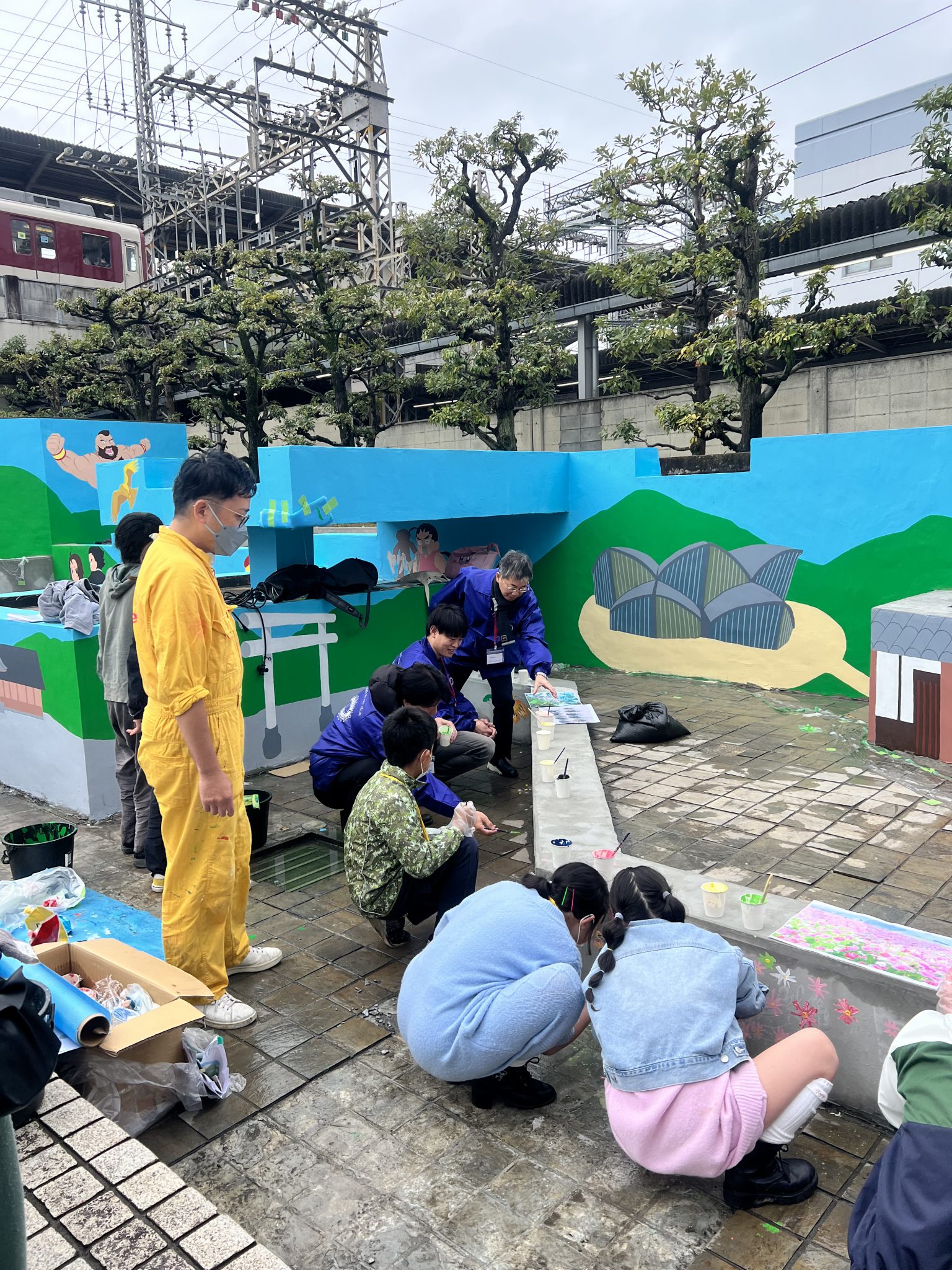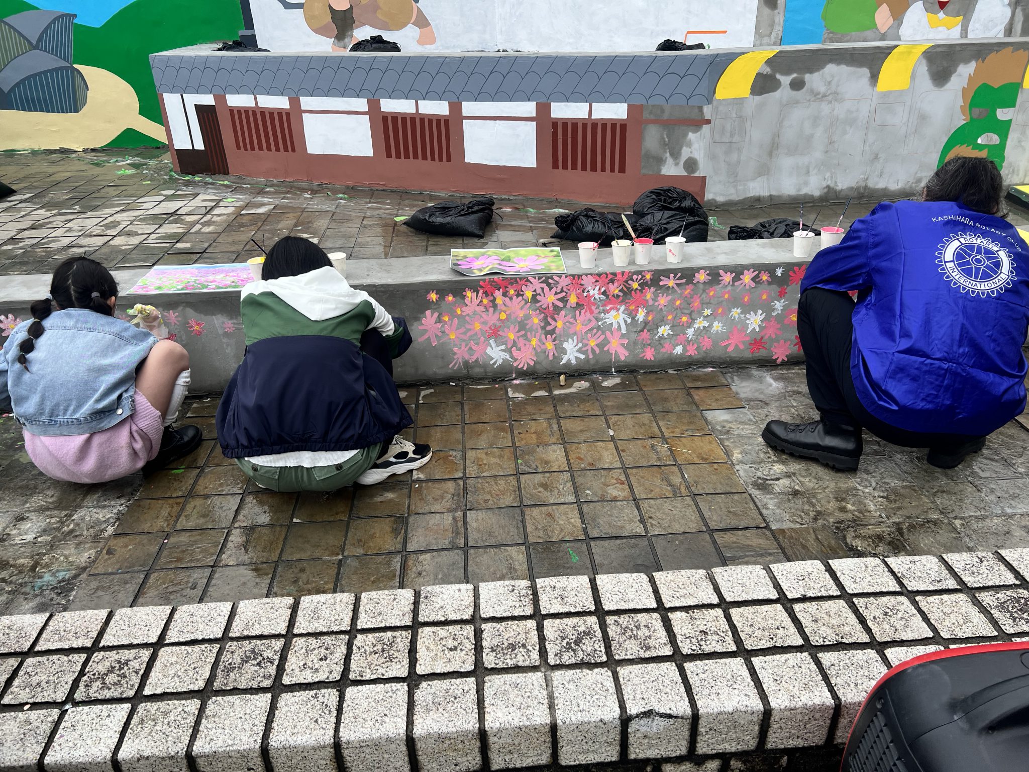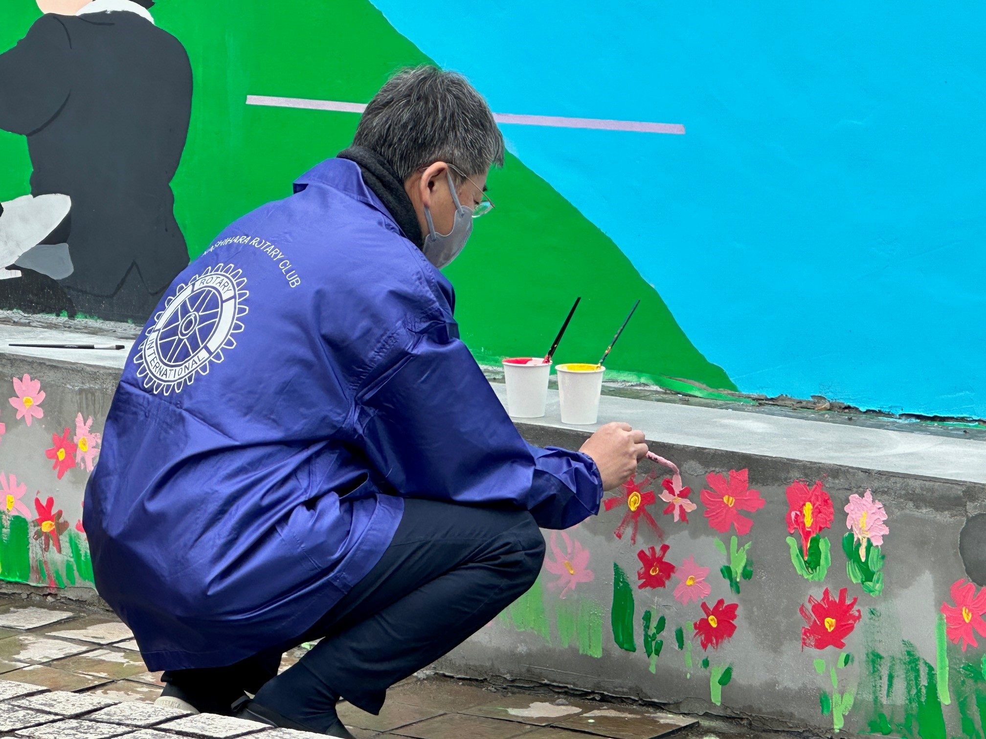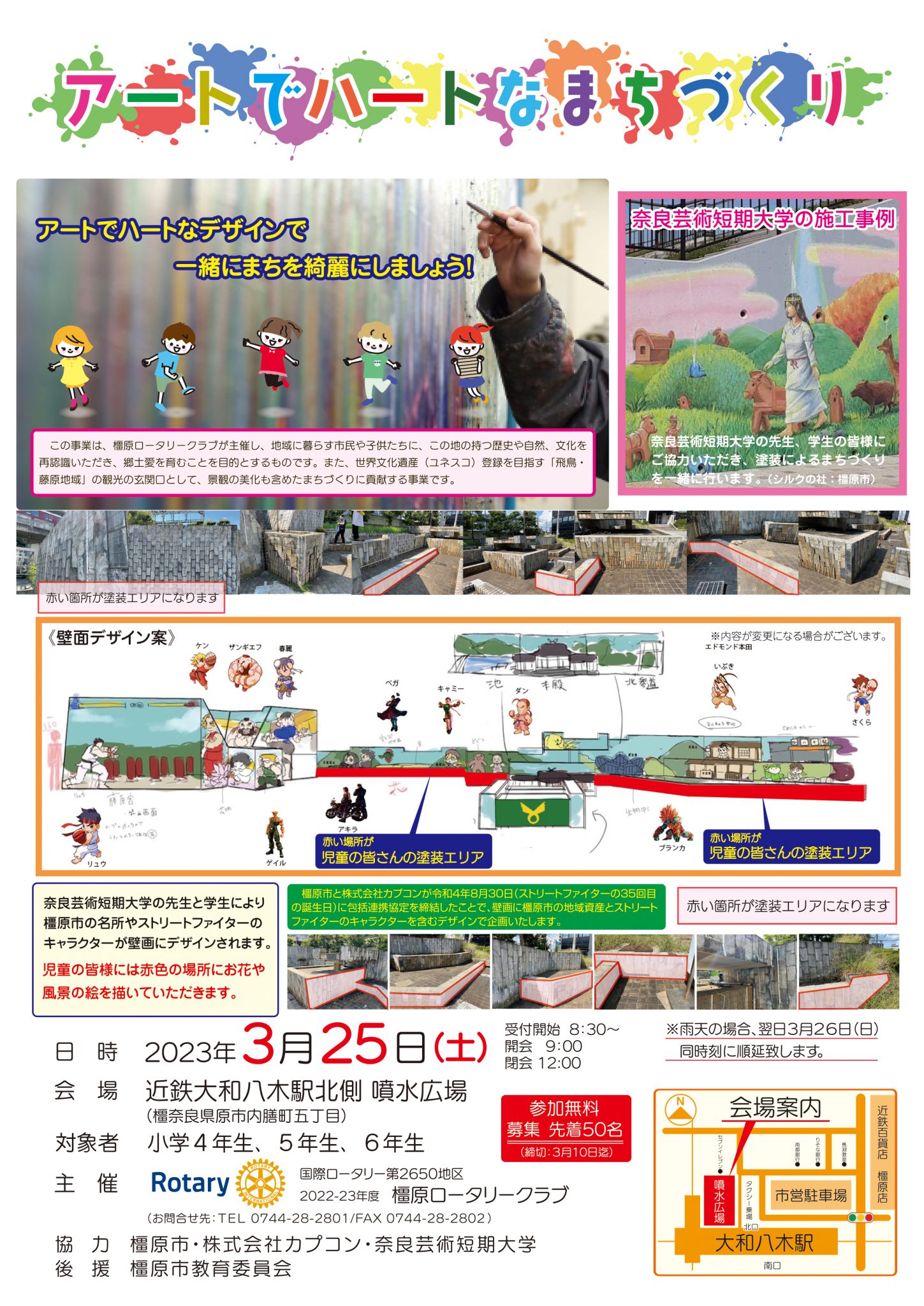 大和八木駅前の噴水広場の壁面の剥離が酷く、崩れ落ちていたため、新たに壁画を作成しました。駅前広場を管理する橿原市に場所の提供を頂き、奈良県を代表する芸術大学でもある奈良芸術短期大学の協力を仰ぎ、この地にふさわしい絵を提案頂き、橿原市と共に協議を重ねながら、壁画のデザイン決定を行いました。また、ゲーム開発企業「カプコン」社の創業者が地元出身ということもあり、カプコン社が手掛ける人気ゲームソフト「ストリートファイター」のキャラクターの無償使用許可を頂き、デザインに盛り込ませて頂きました。本事業には橿原市教育委員会から後援を頂き、市内小学校の子ども達へチラシを配布しました。3月25日(土)には、地元の子ども達とその保護者、奈良芸術短期大学の皆さん、当クラブが提唱している橿原ローターアクトクラブ・橿原学院高校インターアクトクラブの皆さん、当クラブの会員など、多数が参加し、大人も子供も一緒になって楽しみながら壁画作成を行いました。事業の様子は、奈良テレビ放送のニュースで取り上げて頂きました。