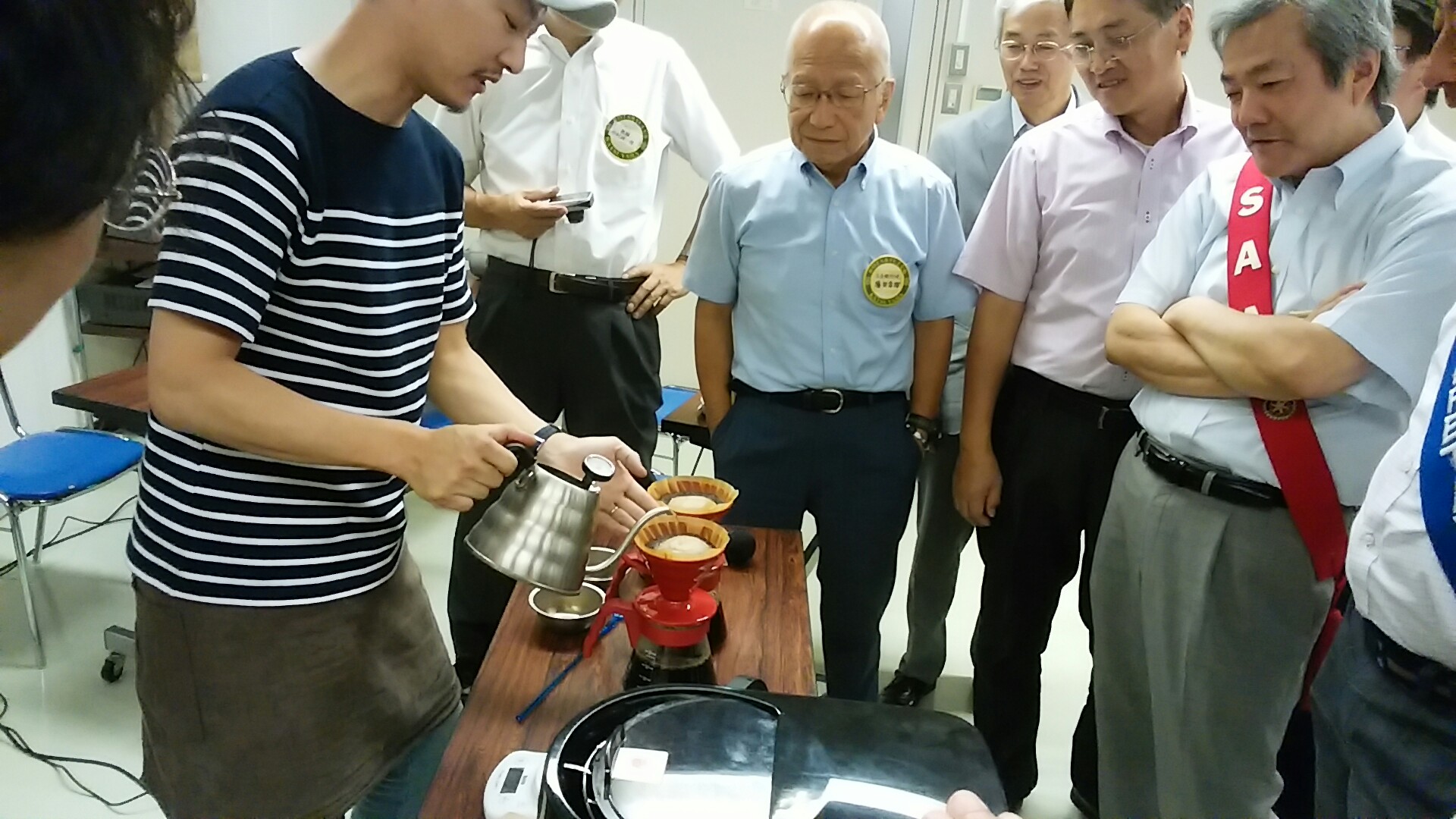 「コーヒー豆はサクランボのような木の実の中の種です。コーヒーは果物であり、いろんな人の手を渡ってできている尊いものです。コーヒー豆は生産者すなわちコーヒーの苗を植える方、実を収穫する農家の方、実から種を取り出し、果肉と種の間の粘々したものを水できれいに洗い流し乾燥させて日本に入ってくるという流れであります。それで美味しいコーヒー豆を生産する東ティモールの水への支援をしたいと思っている次第です。本日は皆さんが普段口にしないようなコーヒーを敢えて選んでみました。皆さんに淹れるコーヒー豆は中米エルサルバドル産です。コーヒーは果実であること、その果実の甘味が味わえるコーヒー豆です。今日は皆さんにコーヒーは果物であることを知っていただきたいと思います。」