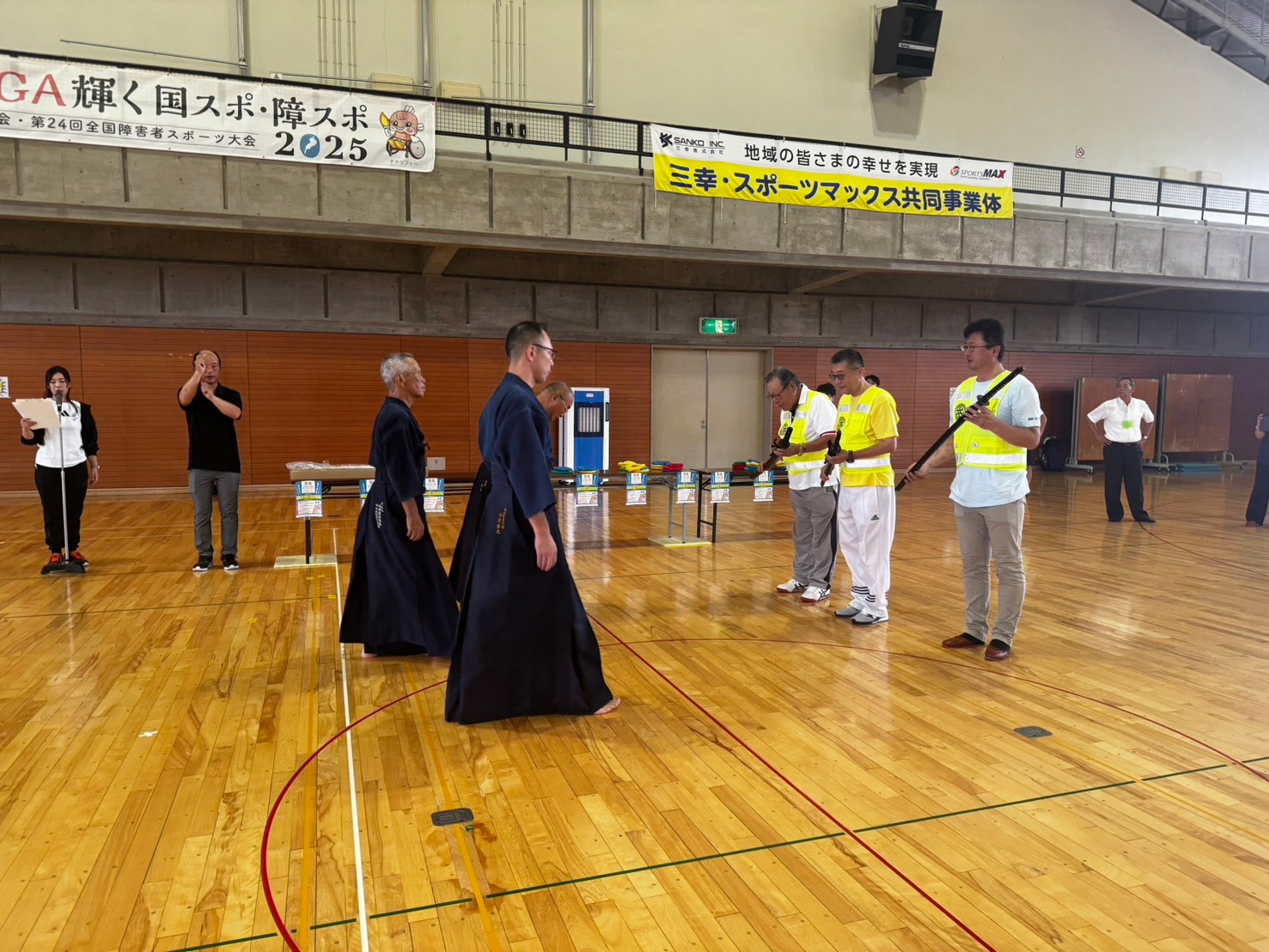 また、剣道には剣道形用居合刀を、キンボールには試合用ボールとあわせて子どもたちに新しいスポーツであるキンボールを体験していただけるよう小学生用のボールを、バレーボールには試合球を贈呈いたしました。その贈りました刀を使って、模範演技をご披露いただきました。
