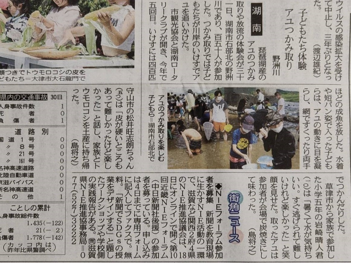 7月31日(日)野洲川鮎フェアを開催しました。市内外から約130名の参加があり、子どもたちが鮎の放流やつかみ取りの体験をしました。捕まえた鮎は炭火焼きにして味わい、夏休みの楽しい思い出が出来ました。その様子は中日新聞に掲載されました。