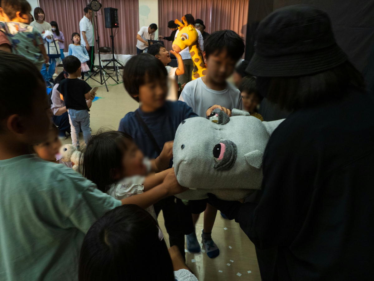 最後の人形劇「なかよし」が終わり、みんな手作りの人形に興味津々