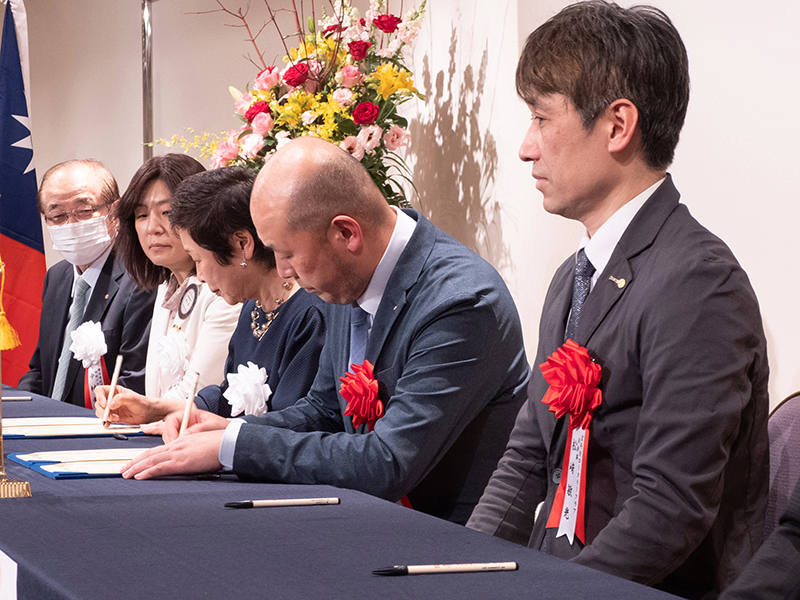 締結式当日は、港北区長漆原様、港北警察署長加藤様、台湾より横浜港北RC様の姉妹クラブである劍潭(ケンタン)RCの皆様をはじめ、多くのご来賓の皆様にご臨席賜り、締結書にサインをさせて頂きました。また、尾賀ガバナーからの祝電披露もあり、締結式に花を添えて頂きましたことを、この場を借りて厚く御礼申し上げます。