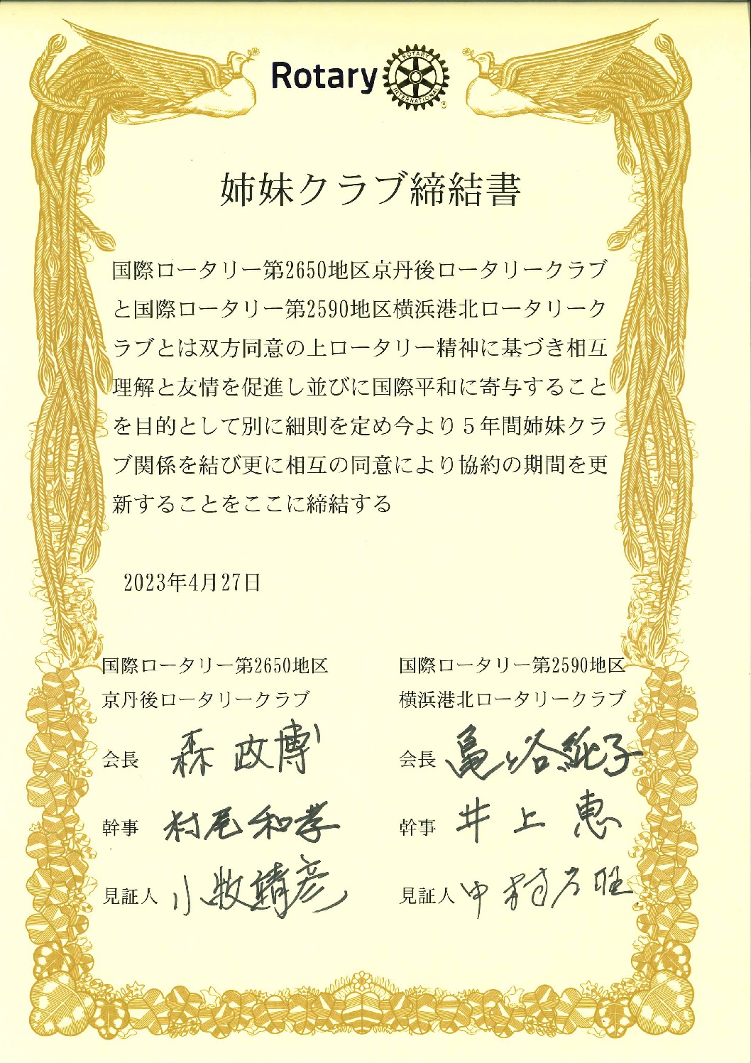 国際ロータリー第2590地区 横浜港北ロータリークラブとの友好姉妹締結