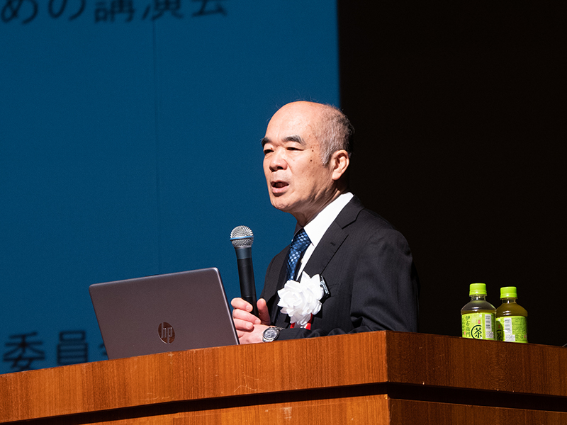 講演会のテーマと講師の山形茂生先生(元JICAニジェール支所長)
