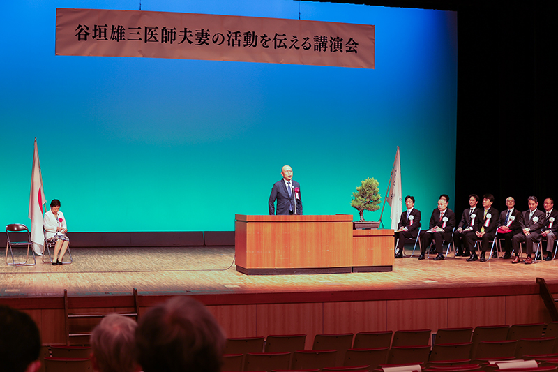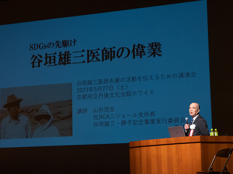京都府丹後出身の谷垣雄三氏は、京都府立峰山高等学校卒業の後、国立信州大学医学部に進まれ、医師になられました。その後、西アフリカの砂漠の国・ニジェールで外科医として、献身的に現地医療にご尽力されました。医療そのものが未成熟である地において、必要な医療機器も不足する中、時に全くない状況で創意工夫を重ねて治療を続けられるご夫妻の姿に、信州大学医学部の同期で、横浜港北ロータリークラブの東 璋(ヒガシ アキラ)氏が感動され、物心両面にわたる支援をはじめられました。それが横浜港北ロータリークラブを挙げての取組となり、続いて谷垣雄三氏の故郷、京丹後の峰山高校同級生グループが呼応することで、大きな支援の輪が広がっていきました。更に、支援グループのメンバーはニジェールの病院を訪問し、現地の人々との交流を深められました。残念なことに、2017年3月7日に谷垣雄三氏がニジェールで急逝されましたが、その功績が認められ、現地で国葬されることとなりました。