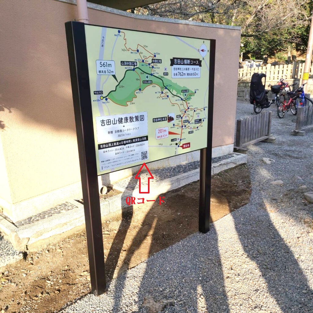 「吉田山健康散策図」パネルは、吉田神社の参道入口、東大路通から東一条通へ入ったさきの二の鳥居付近に設置いたしました。このパネルには、当クラブのホームページに掲載している「吉田山健康散策図」へアクセスできるQRコードを記載しております。スマートフォンでQRコードを読み取ることで、散策路の距離や高低差といった健康増進に役立つ情報が満載された当クラブのホームページを、地域の方々や吉田神社への参拝者、散策者に広くご覧いただける仕組みです。