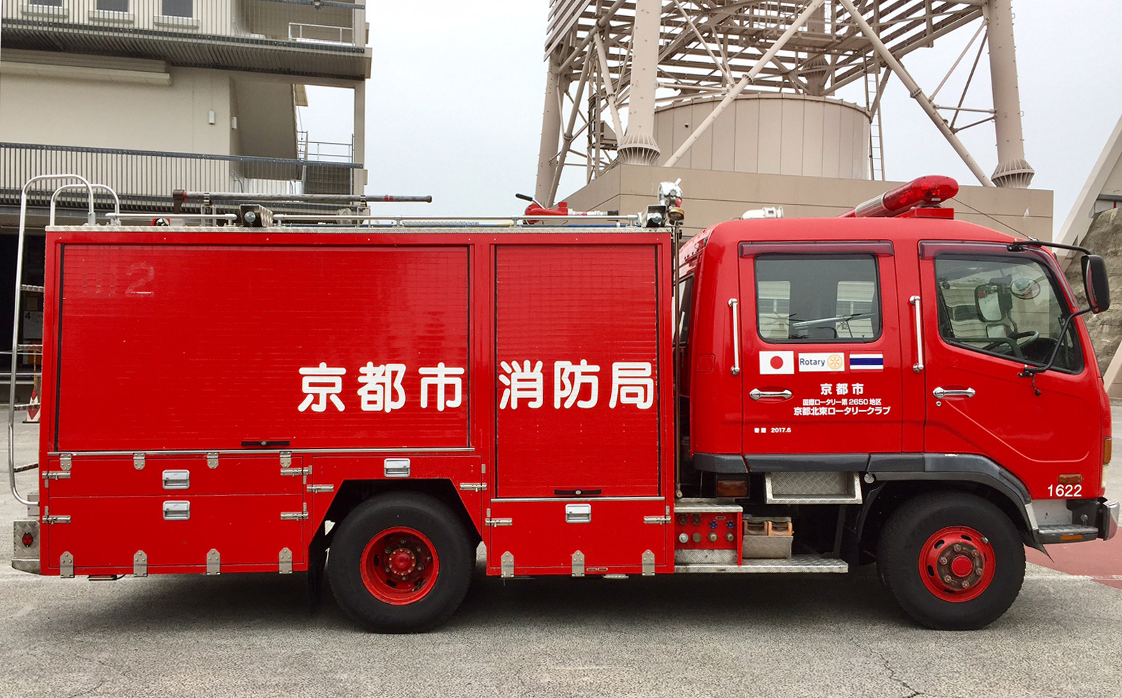 国際ロータリー第2650地区 京都北東ロータリークラブ(会長 西村泰明)にコーンケーン市長から要望のあった消防自動車の寄贈が、このたび京都市、京都市消防局の全面的なご支援により実現することとなりました。本プロジェクトは京都北東ロータリークラブと姉妹クラブであるケンクンロータリークラブ(KAEN KOON ROTARY CLUB・タイ)の共同事業となっており、京都市が更新することになった消防自動車2台を無償で払下げ、京都北東ロータリークラブはこのプロジェクトの日本側責任者としてタイまでの輸送を、ケンクンロータリークラブはタイ側の責任者としてタイ国内の輸送を担当し、コーンケーン市へ寄贈するものです。