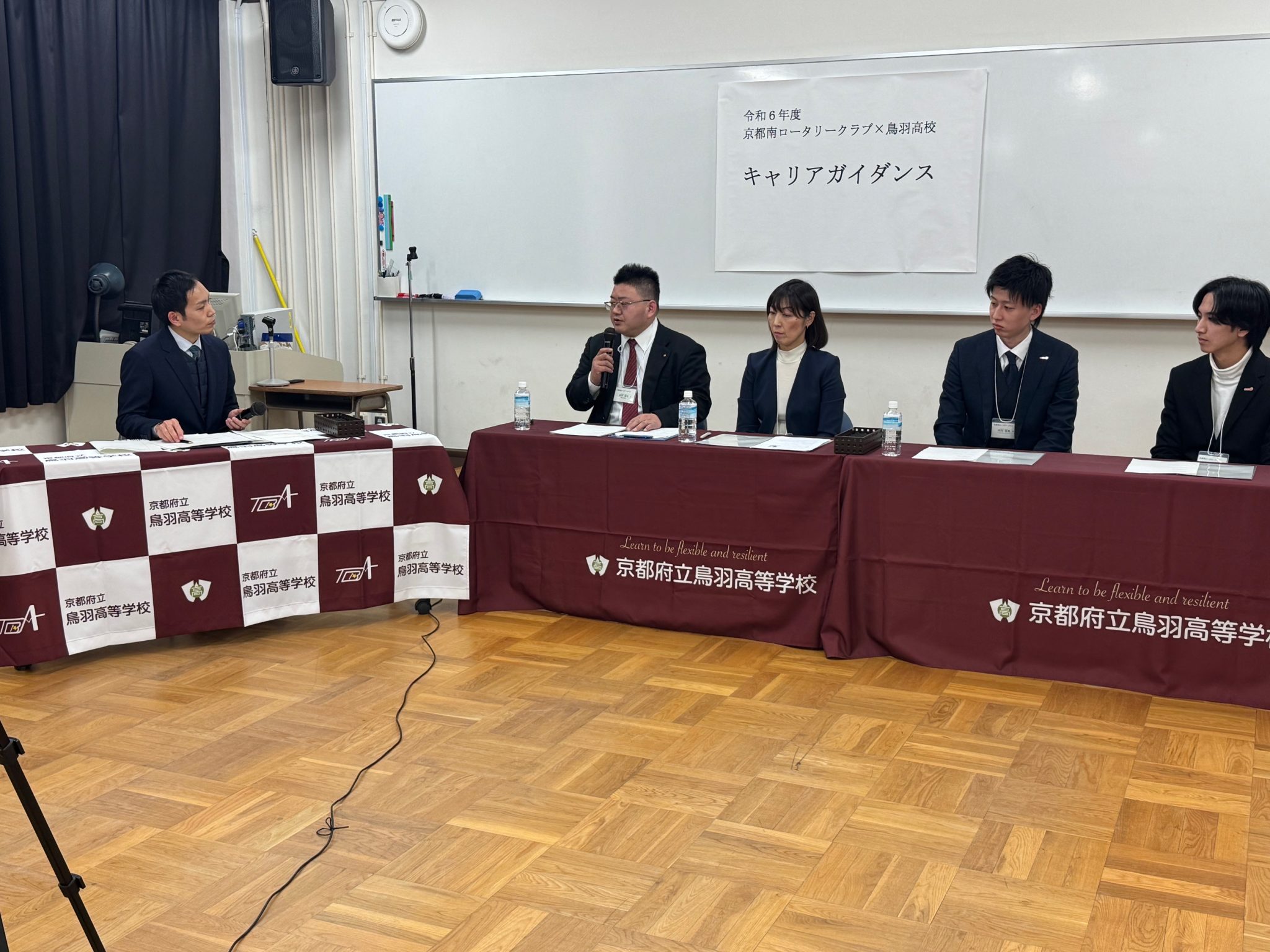 京都府立鳥羽高等学校の1年生270名を対象に、京都南ロータリークラブメンバー2名、京都南ローターアクトメンバー2名の計4名がパネラーとなり、継続事業であるキャリアガイダンスが開催いたしました。働く事の意義・求められる人材像などにつき、パネルディスカッションを行い、その後、参加した京都南ロータリークラブメンバー26名、京都南ローターアクトメンバー6名が、各教室に分かれ生徒たちと一緒に「働くことの意味とは」について、グループディスカッションを行い、次に各クラス代表者が意見発表を行いました。生徒達が何を感じてくれたのか、そしてこれが彼らの今後の学生生活、親御さんの仕事への興味や理解、アルバイトや就職活動等に少しでも影響して、将来職業人としてさまざまな活動をしていく為の糧となるようなキャリアガイダンスを開催できました。