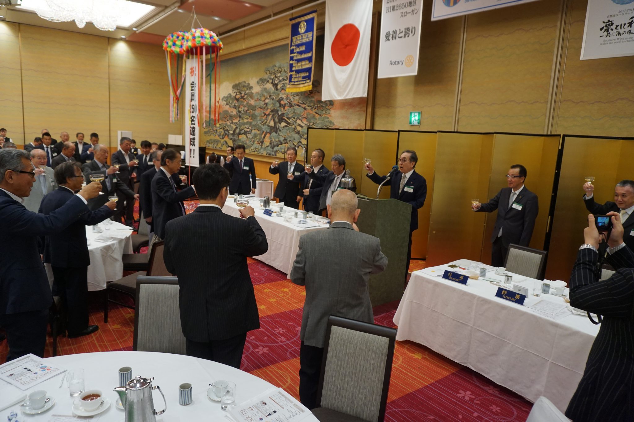 ”祝会員250名達成!!”のくす玉を割り、中澤忠嗣パストガバナーのご発声により乾杯でお祝いしました。