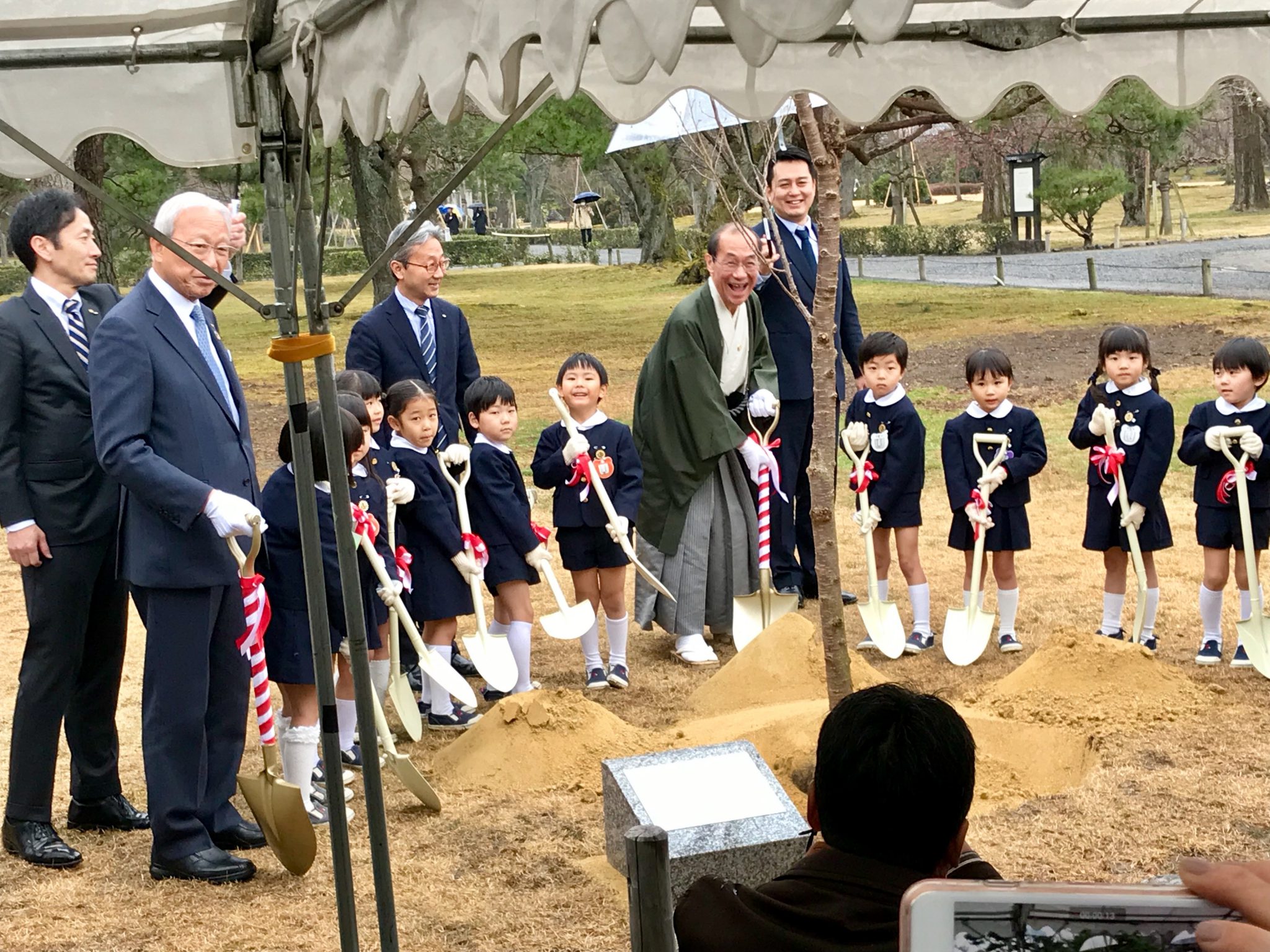 昨年に引き続き、京都南ロータリークラブでは、二条城に桜の植樹を実施いたしました。今年は、創立65周年記念事業の一環として、3月3日(日)に門川京都市長にもご出席いただき、地元のひまわり幼稚園児と一緒に、桜とモミジの木を20本植樹いたしました。