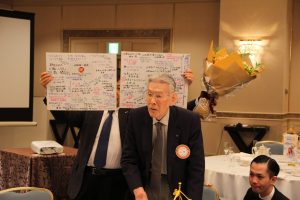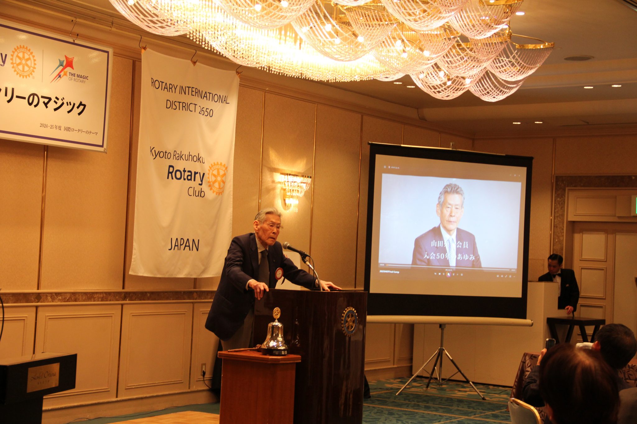 2025年4月3日に在籍50年を迎えた山田榮一会員のお祝いを、4月10日の例会で行いました。在籍50年目の4月3日は、金沢北RCへ友好クラブ訪問で休会になったので、1週間遅れのお祝いとなりました。例会では、お祝いの和弁当・会員事業所の大きな苺を使ったデザート、会員のバンド演奏、記念品と花束贈呈、山田会員の50年の軌跡動画の放映、会員・クラブ関係者80名の 寄せ書き贈呈を行い、皆で楽しい例会を過ごしました。