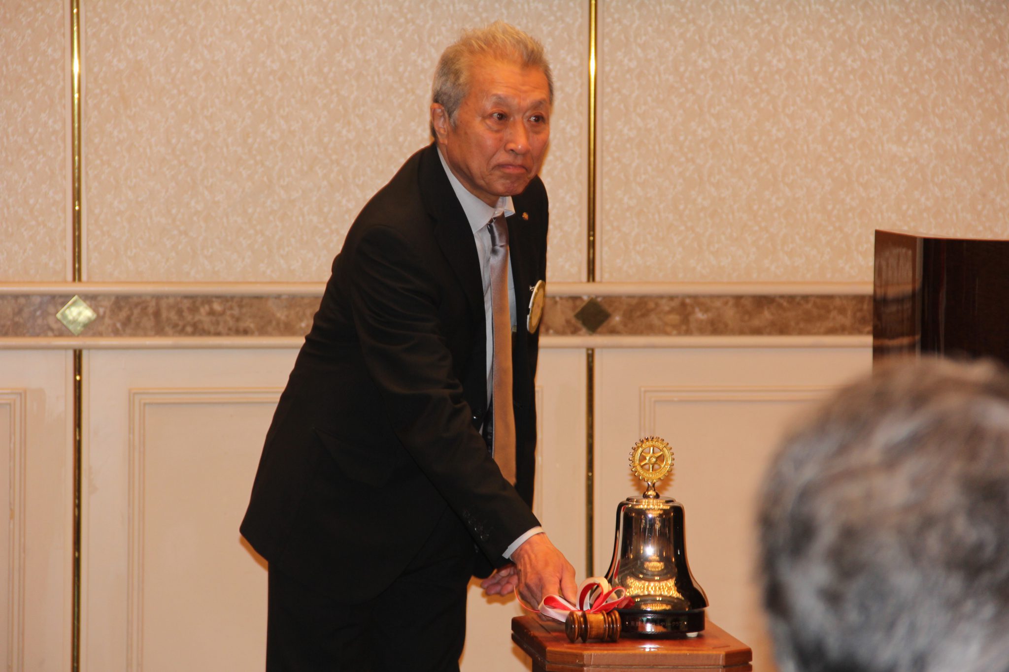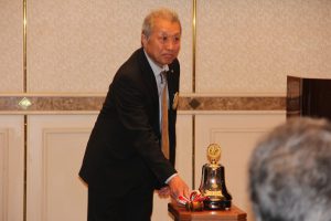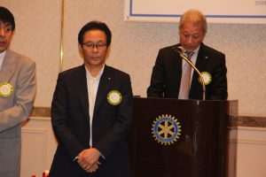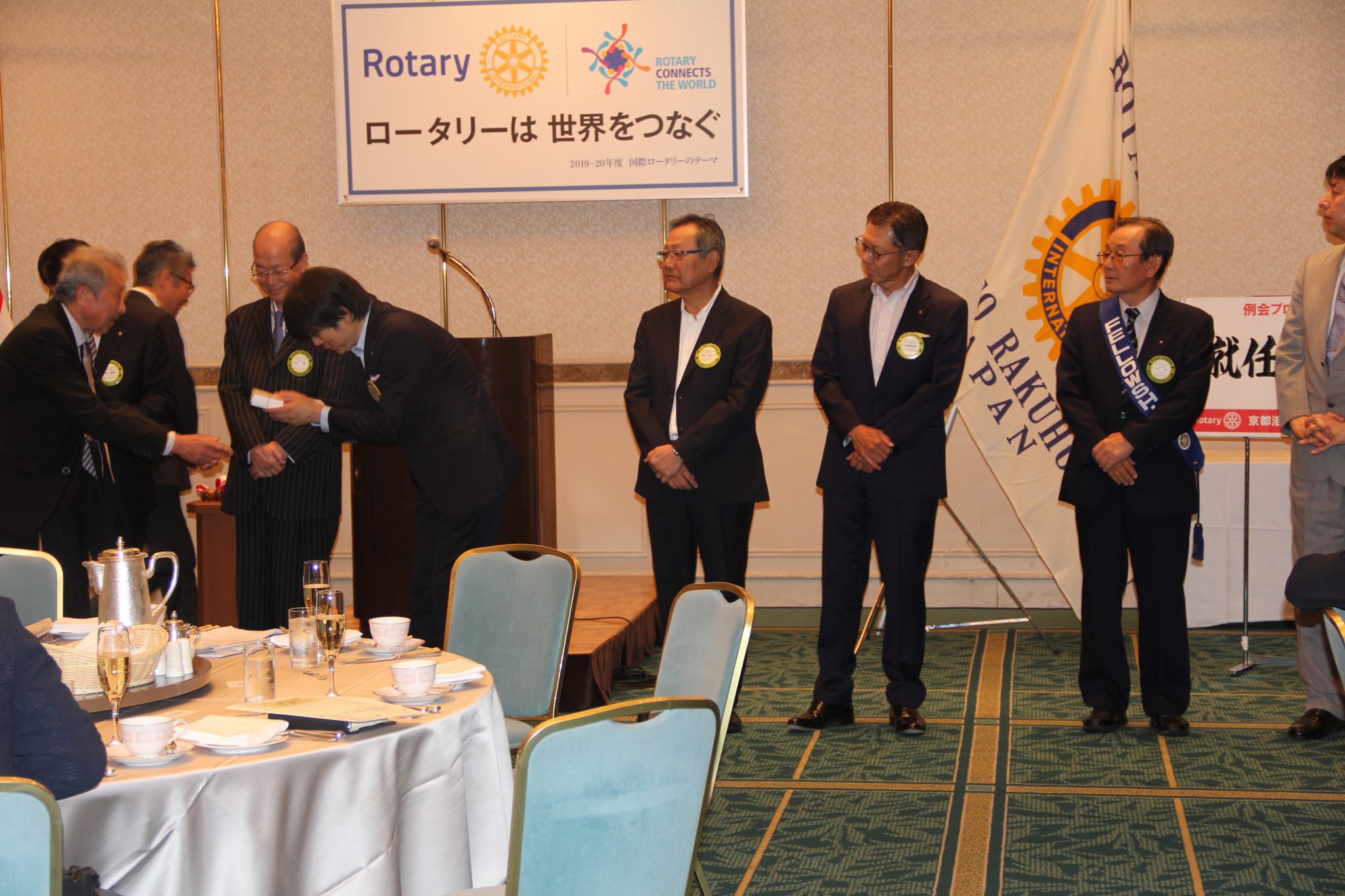 理事会が終わると、いよいよ初例会。開会点鐘の前に、バッジ引き継ぎのセレモニーが行われ、例会が始まりました。例会には、親クラブの京都東ロータリークラブと子クラブの京都北東ロータリークラブの会長幹事が表敬訪問にお見えになりました。また、京都洛北ローターアクトクラブからも、会長がご挨拶に見えました。ハワイのハナレイベイロータリークラブのハシギワさんもMAKE-UPにお越しになり、お客様の多い例会となりました。例会では、退任理事役員への記念品贈呈を行い、その後 就任挨拶 新理事会メンバーの紹介などを行いました。
