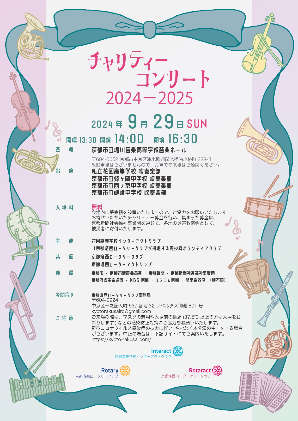 2024年9月29日(日)、京都市立京都堀川音楽学校音楽ホールにて 花園高校インターアクトクラブ主催のチャリティーコンサート2024-25を開催いたしました。