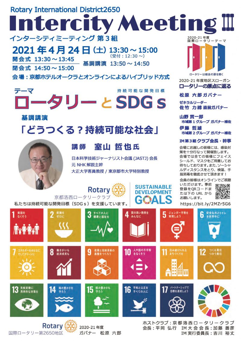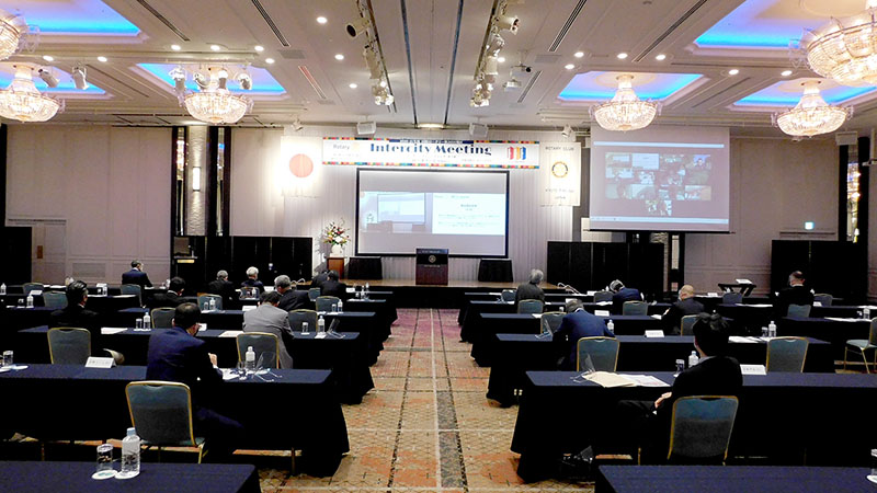 新型コロナウイルスの感染拡大が収まらないなか、今年度のインターシティーミーティング(IM)第3組を無事開催することができました。IMの目的は会員相互の親睦と知識を広めることにあります。当初は昨年の8月に開催を予定し、懇親会も企画していましたが、今回は感染予防対策として4月24日にハイブリッド方式で開催することになりました。そのため松原六郎ガバナーには福井からオンラインでご参加いただき、画面越しに式典の点鍾をしていただきました。また、まん延防止等重点措置期間中にも関わらずゼネラルリーダーをお願いした佐竹力總直前ガバナーと馬場益弘ガバナーエレクト、地区役員の皆様、そして第3組の会長・幹事はじめクラブの皆様には、万全を期した感染防止対策のもと、会場の京都ホテルオークラにリアルでご出席いただきました。またオンラインでは200名を超えるロータリアンの皆様に視聴していただきました。