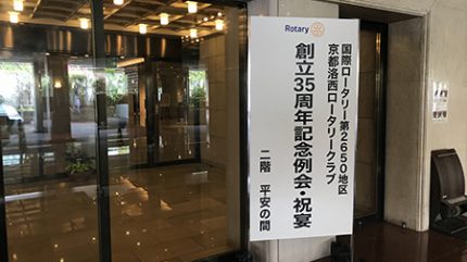 京都洛西ロータリークラブは創立35周年を迎え、5月19日(土)記念例会・祝宴を開催いたしました。カンボジアミッションにちなみ、ご来賓としてカンボジア王国特命全権大使をお迎えし、社会奉仕活動と青少年奉仕活動にちなんで、西脇隆俊京都府知事と前川大作京都市長にご列席いただきました。また千玄室RI元理事と田中誠二ガバナーがお祝いに駆けつけていただきました。