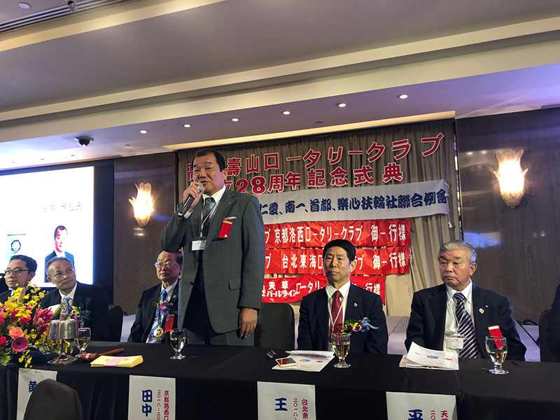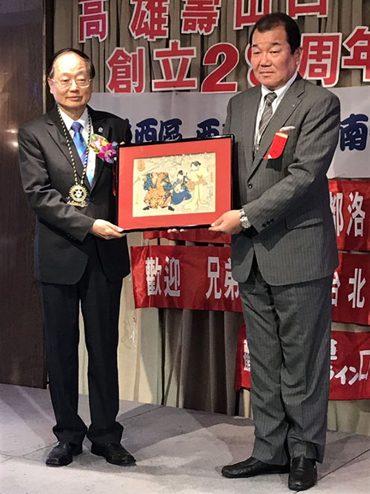 11月12~14日の3日間、当クラブ姉妹友好クラブの高雄壽山RC28周年記念式典に我がクラブより6名で参加してまいりました。到着した空港では壽山RCの皆様から手厚い歓迎を受けました。14日に行われた記念式典は台湾各地からもたくさんのRCの会長や地区ガバナーの方たちが参加され盛大に執り行われました。当クラブからは恒例となっている書籍の贈呈や記念品の交換等を行いました。また私たちと同じように周年記念式典に参加のために熊本県天草市より来られた天草パールラインRCの皆様ととも交流を深められ貴重な時間を過ごすことが出来ました。