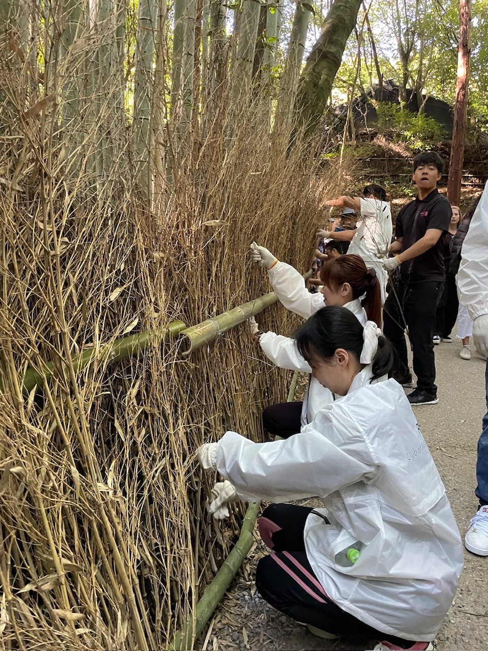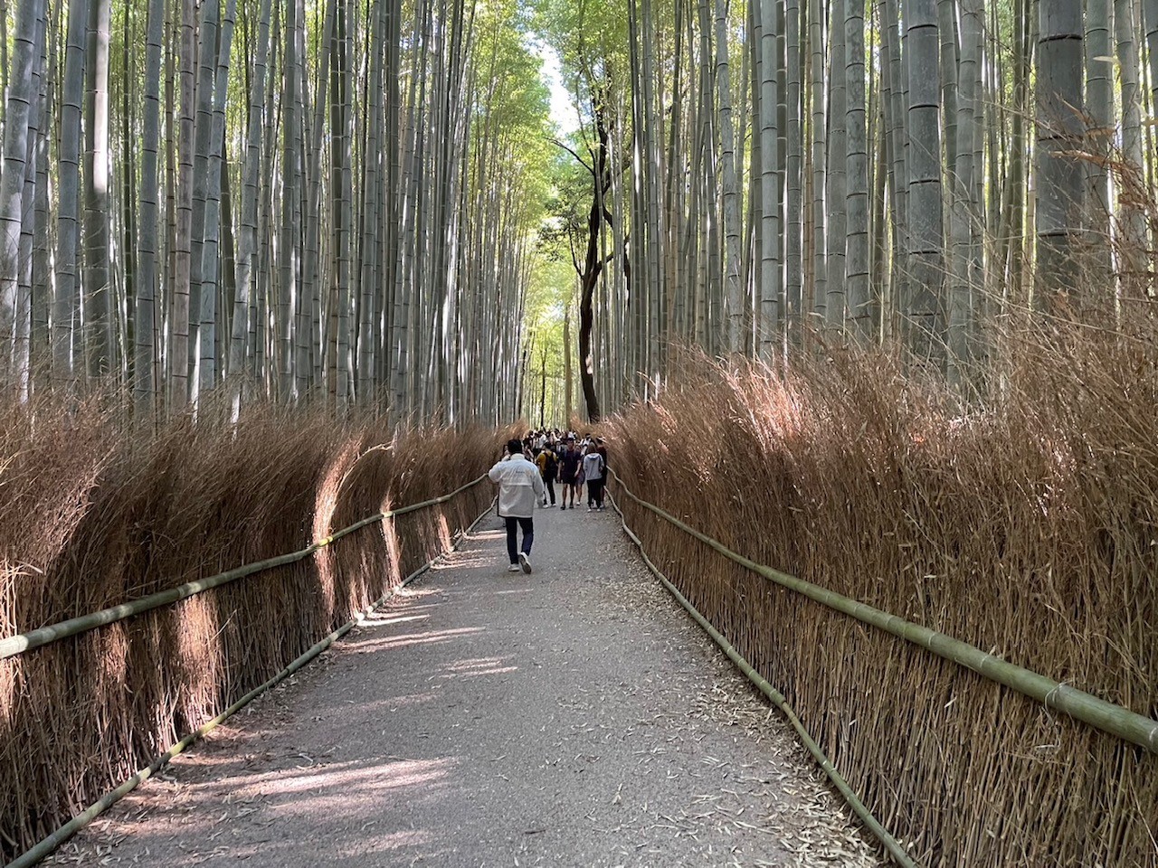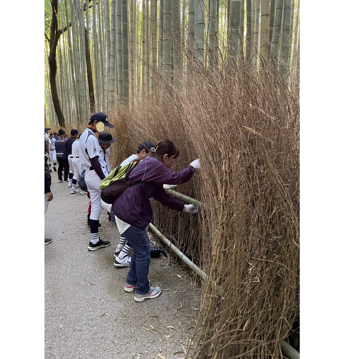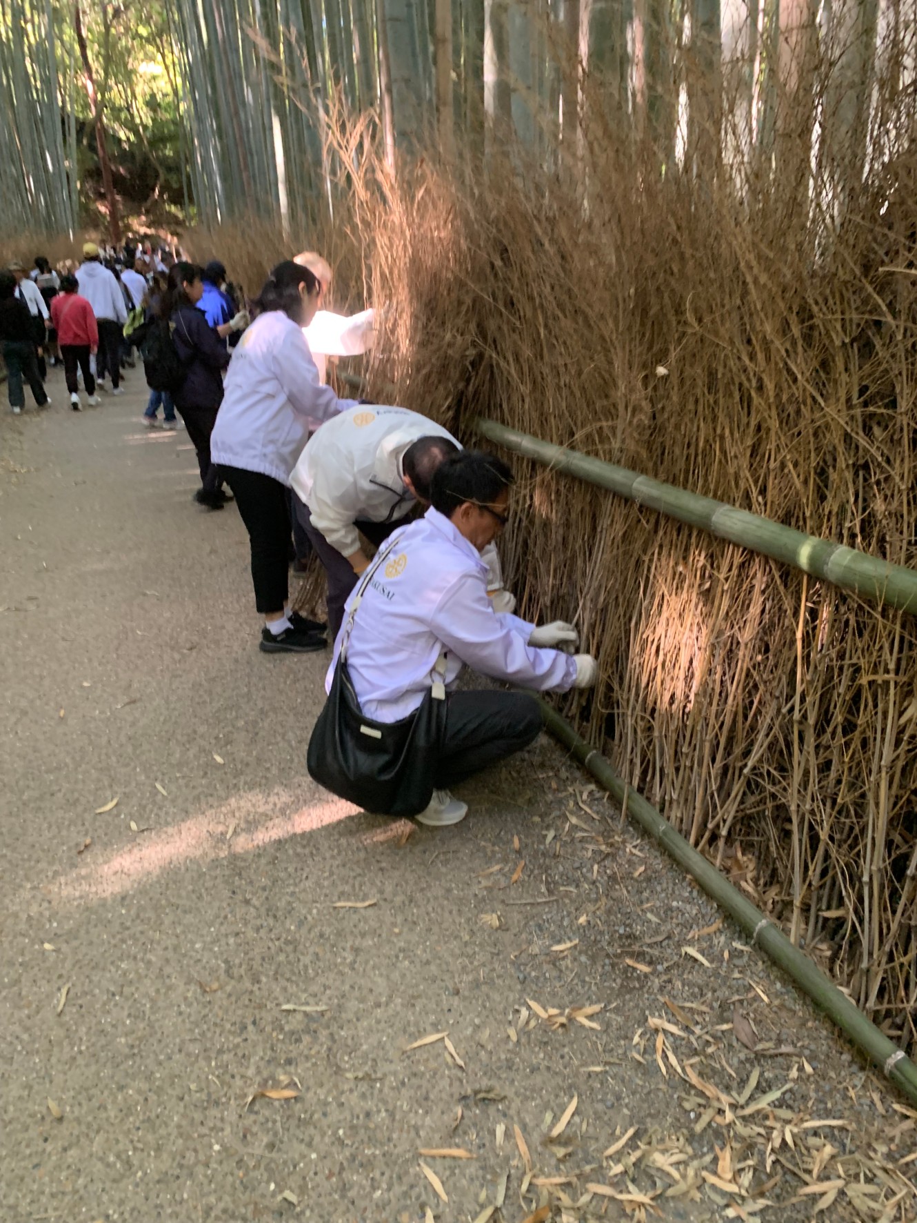 参加者の皆さんで熱心に作業をしていただき、とてもきれいに竹穂垣がよみがえりました。観光に来られている外国の方も大変興味深く見られていて、写真撮影されている方も沢山おられました。今回、多くの若者に参加頂き、改めてこの素晴らしく美しい景観を守り、次世代でしっかり引き継ぐ必要性を感じさせていただきました。作業後は大河内山荘さまのご厚意でお庭の見学とお抹茶を頂戴し、参加者の皆様は達成感に浸りながら疲れを癒しました。