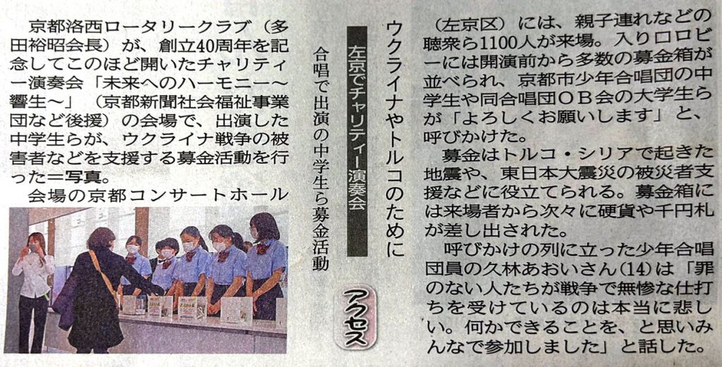 去る2023年2月19日京都コンサートホール大ホールにて京都洛西ロータリークラブ創立40周年記念チャリティーコンサート 『未来へのハーモニー~響生(きょうせい)~ 』を開催いたしました。