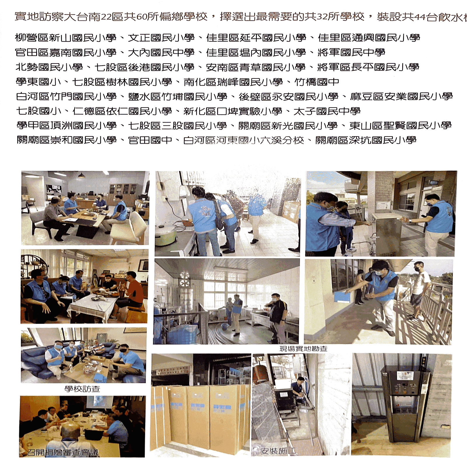 ウォーターサーバ設置の台南22区32校の小中学校と記録
