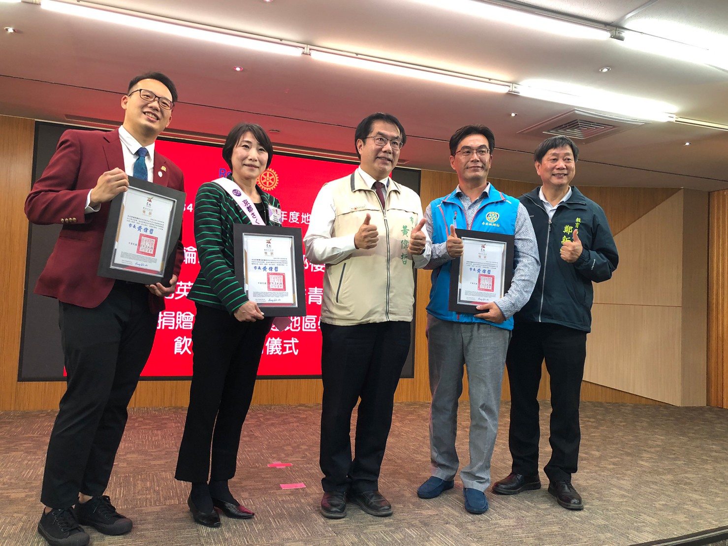 右から教育委員長、サッカムRC RYAN会長、黄市長、京都さくらRC神田会長、台北英倫RC会長