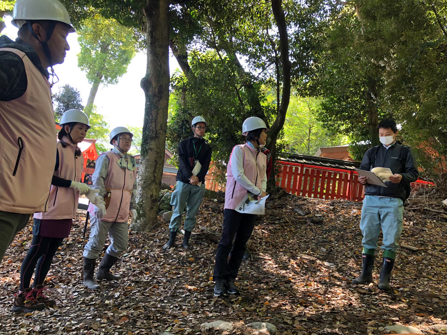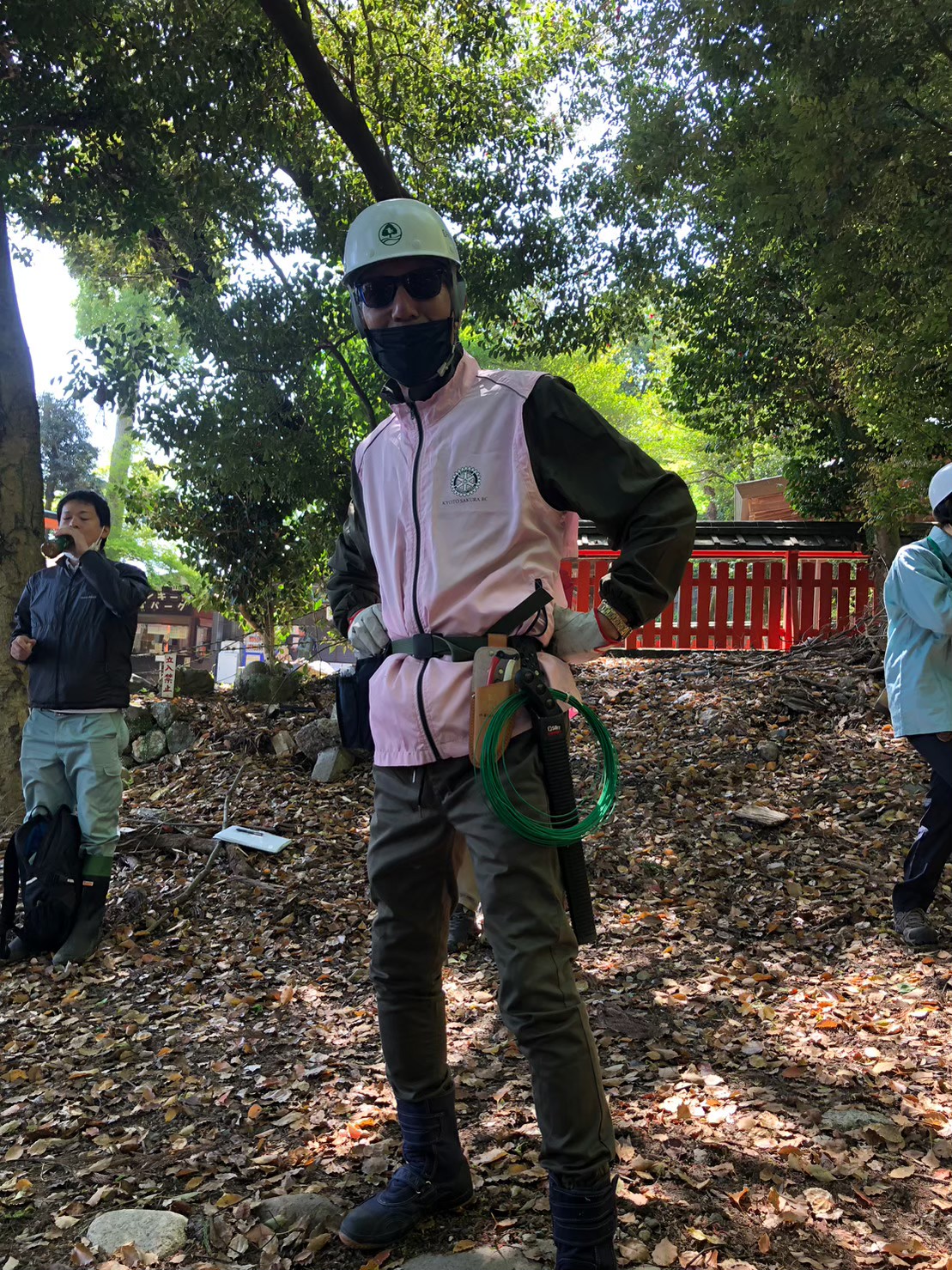 渡月橋南詰モンキーパークに隣接して鎮座する櫟谷宗像神社(いちたにむなかたじんじゃ)奥から上に続く立ち入り禁止エリアが対象で対岸には天龍寺を望む場所。いつも反対側から美しい自然の風景をみていた場所でした。早速その日のうちにヘルメットを被り除伐しない木々にピンクのリボンを巻く作業をざっと1時間ほどで済ませ。あとは当日を待つばかり。