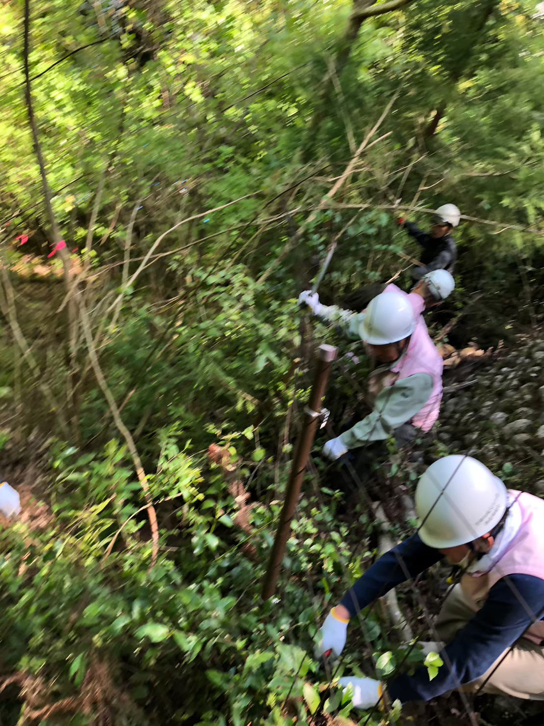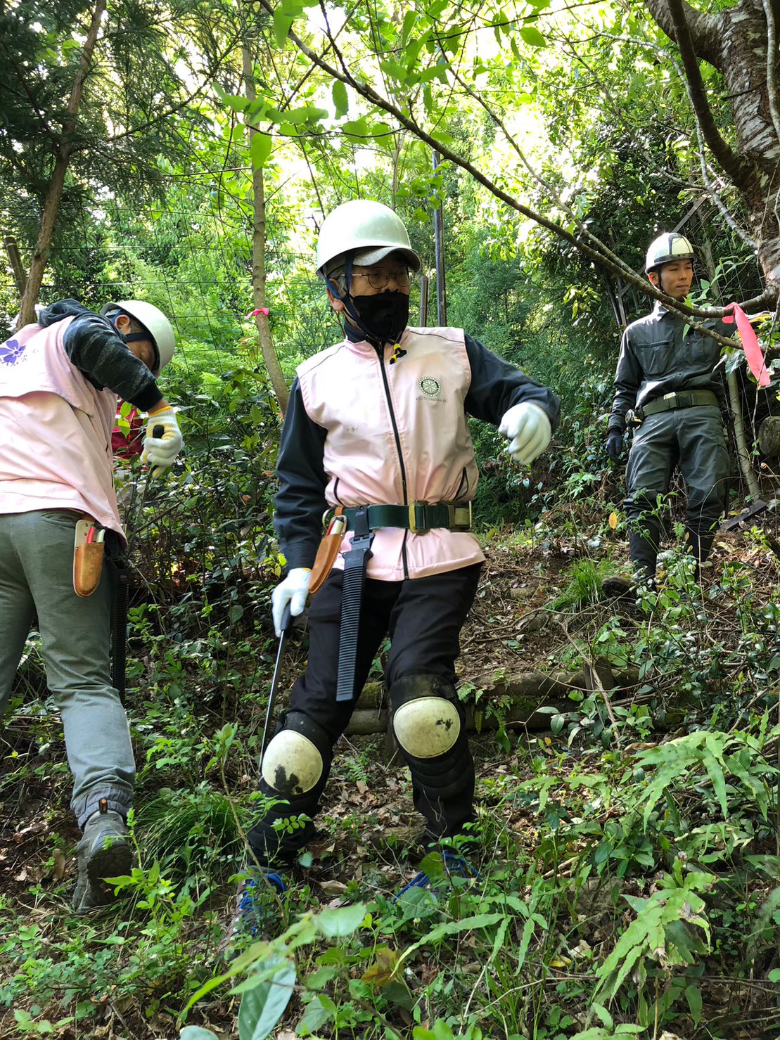 久保田エレクト 本格的な装備でご満悦。急傾斜での除伐と金網補修へ立候補。
