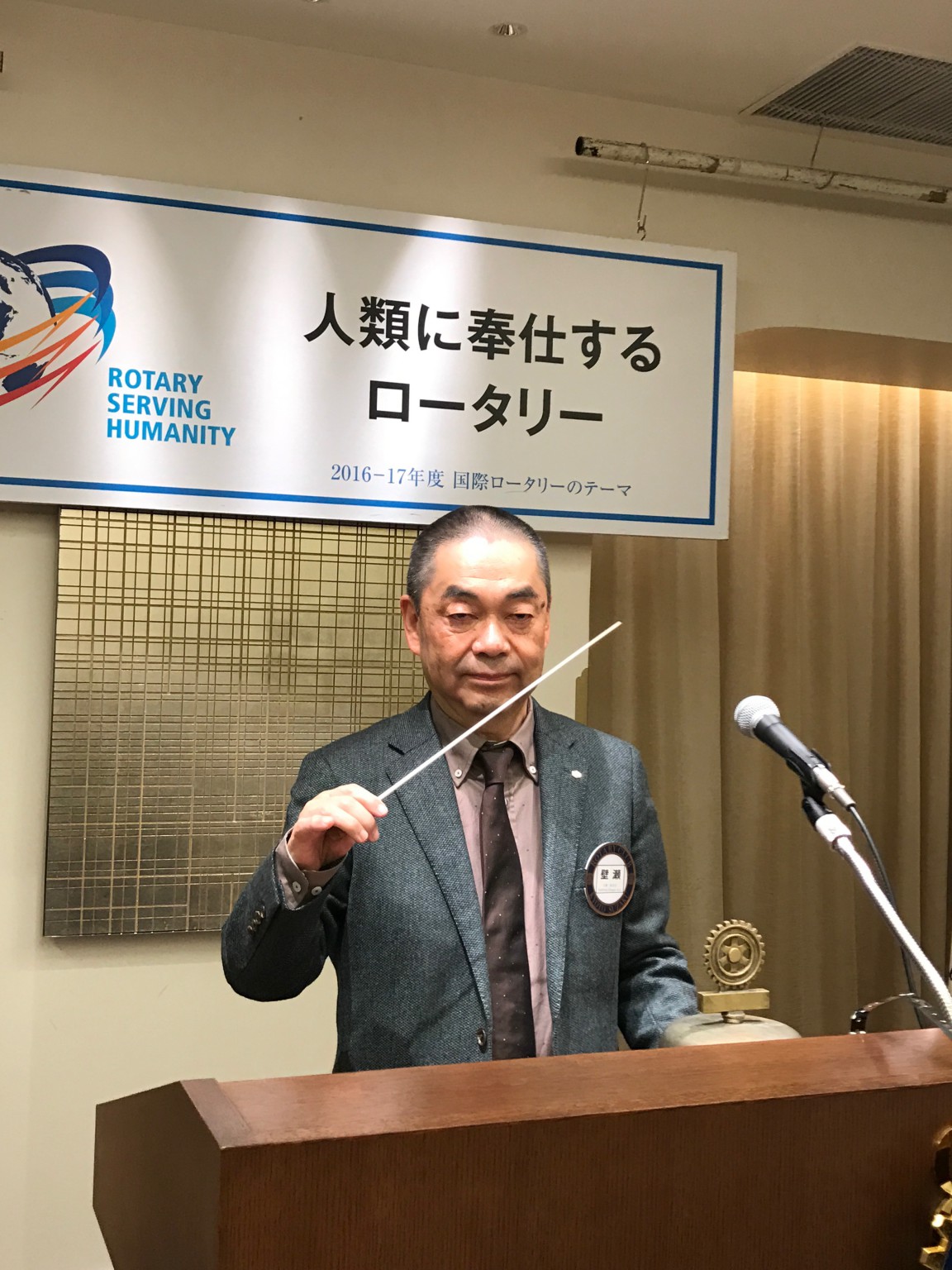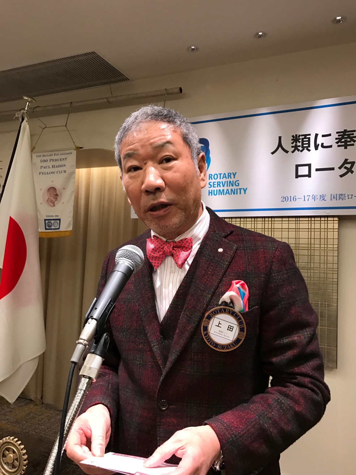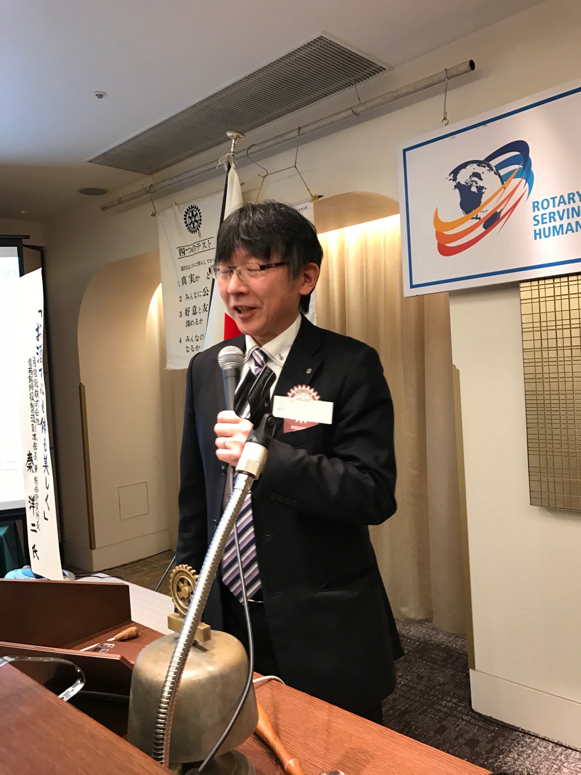 上田会長の開会点鐘、そして病から復帰された壁瀬会員の指揮のもと、「四つのテスト」を会員で歌いました。