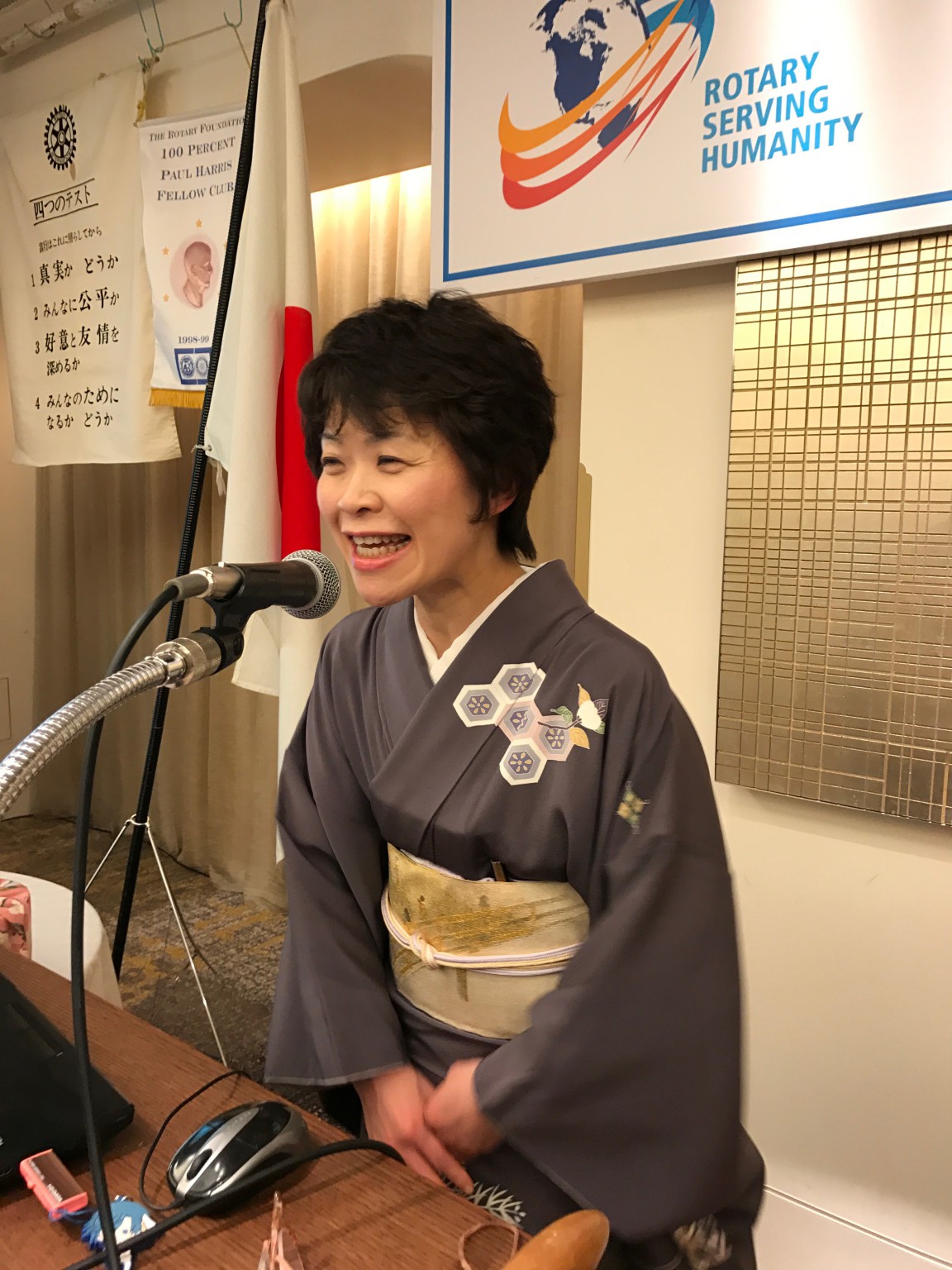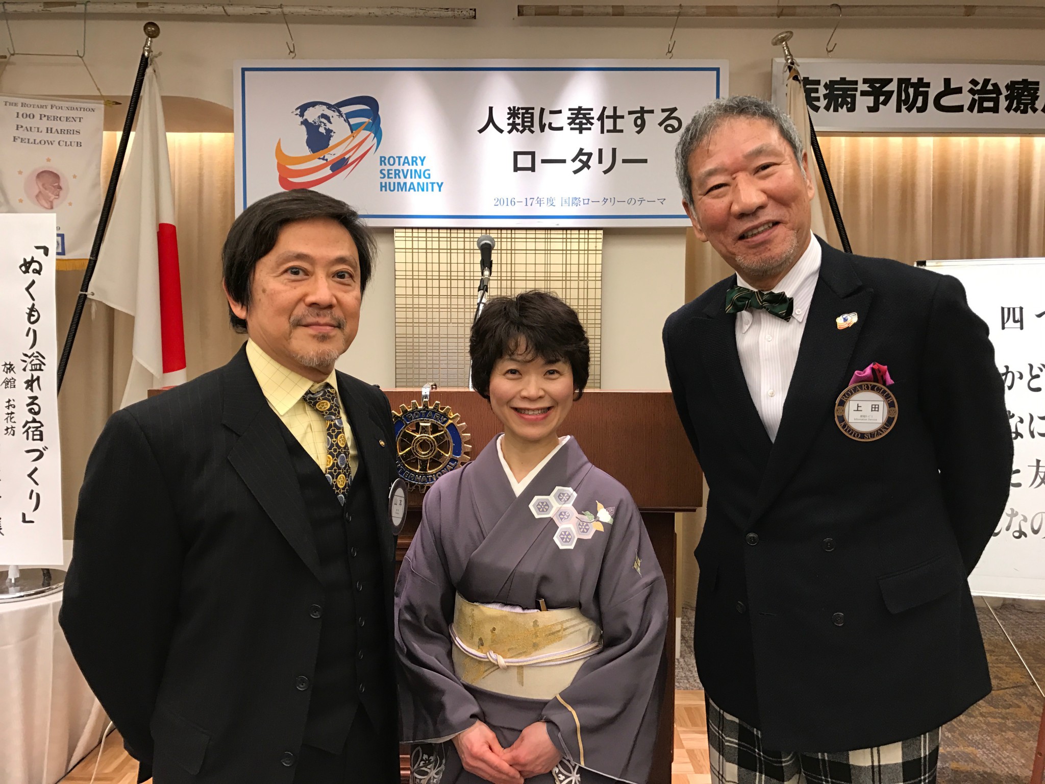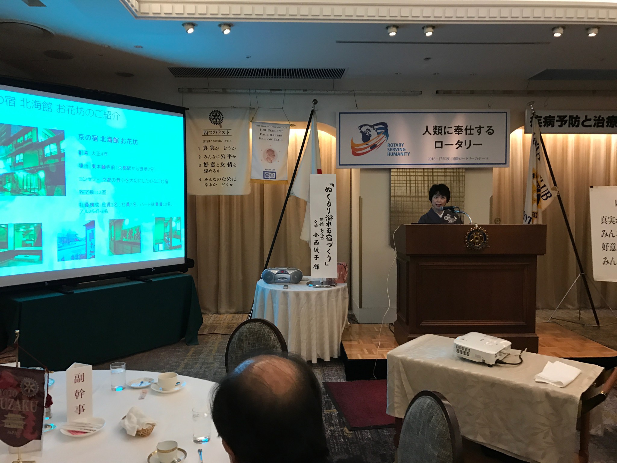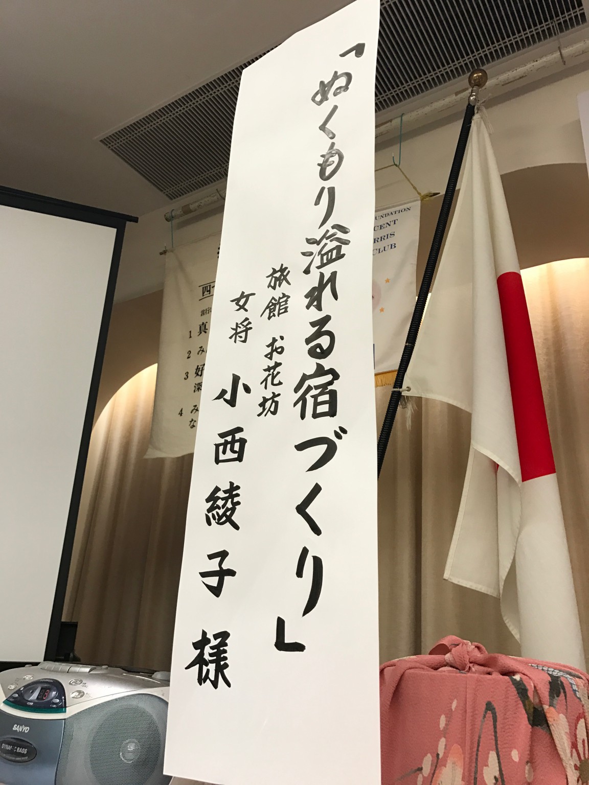 そして本日の卓話は【ぬくもり溢れる宿づくり】というテーマで旅館お花坊の女将・小西綾子さまにお話しいただきました。