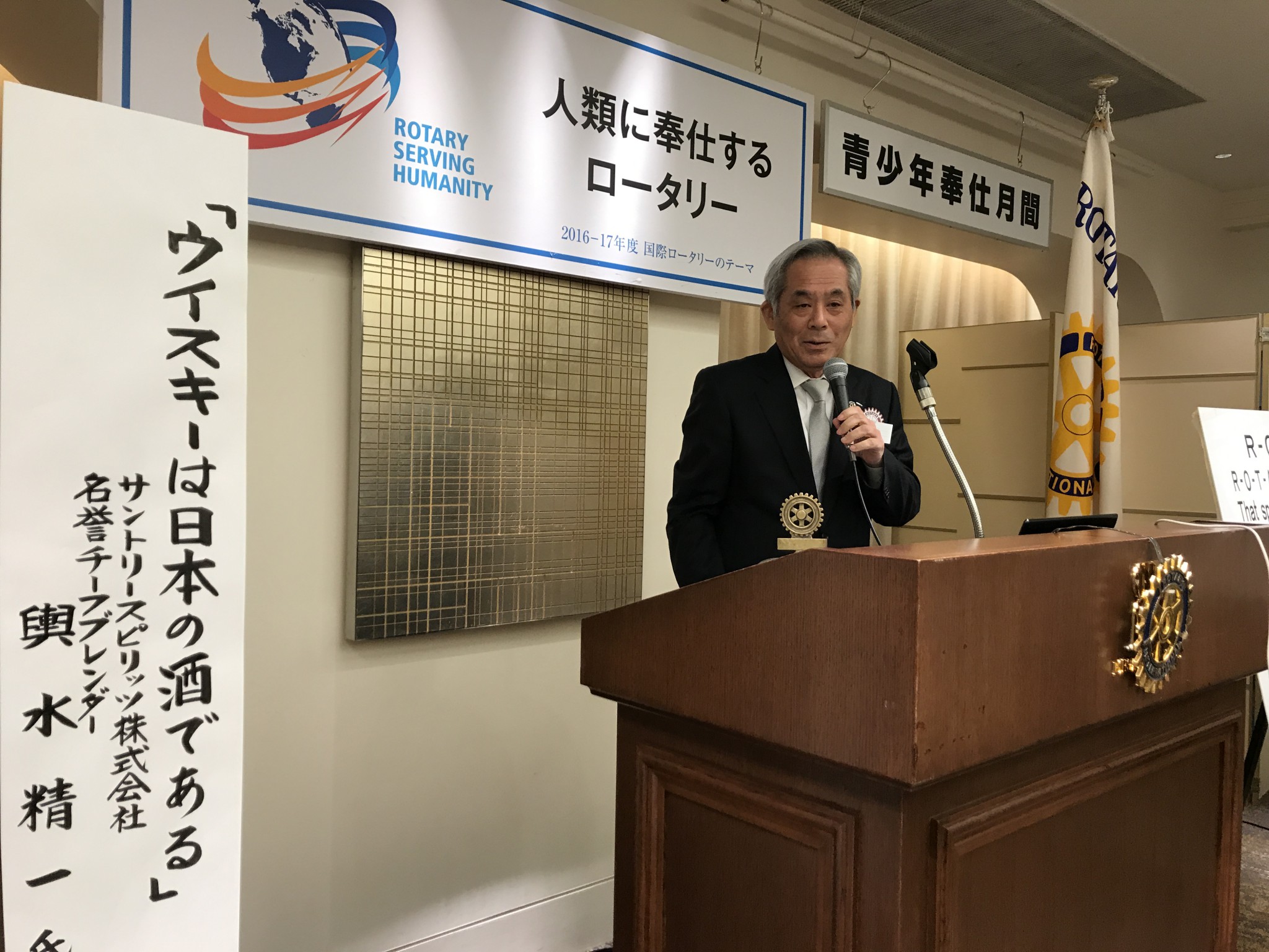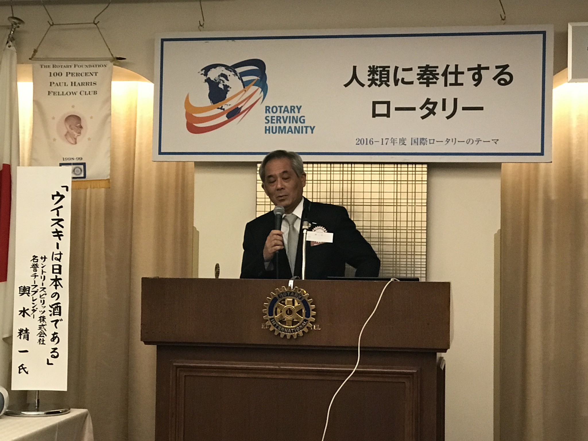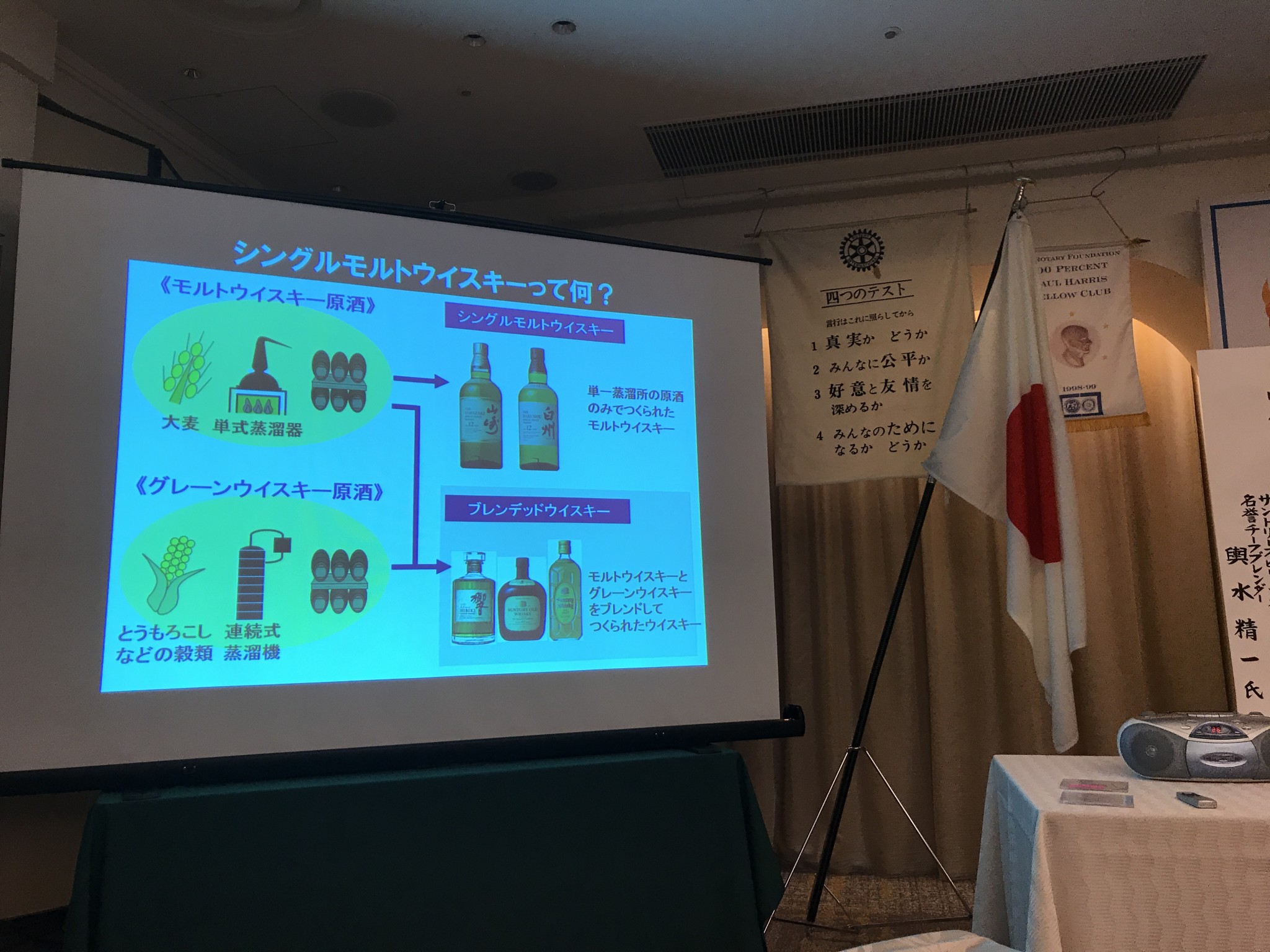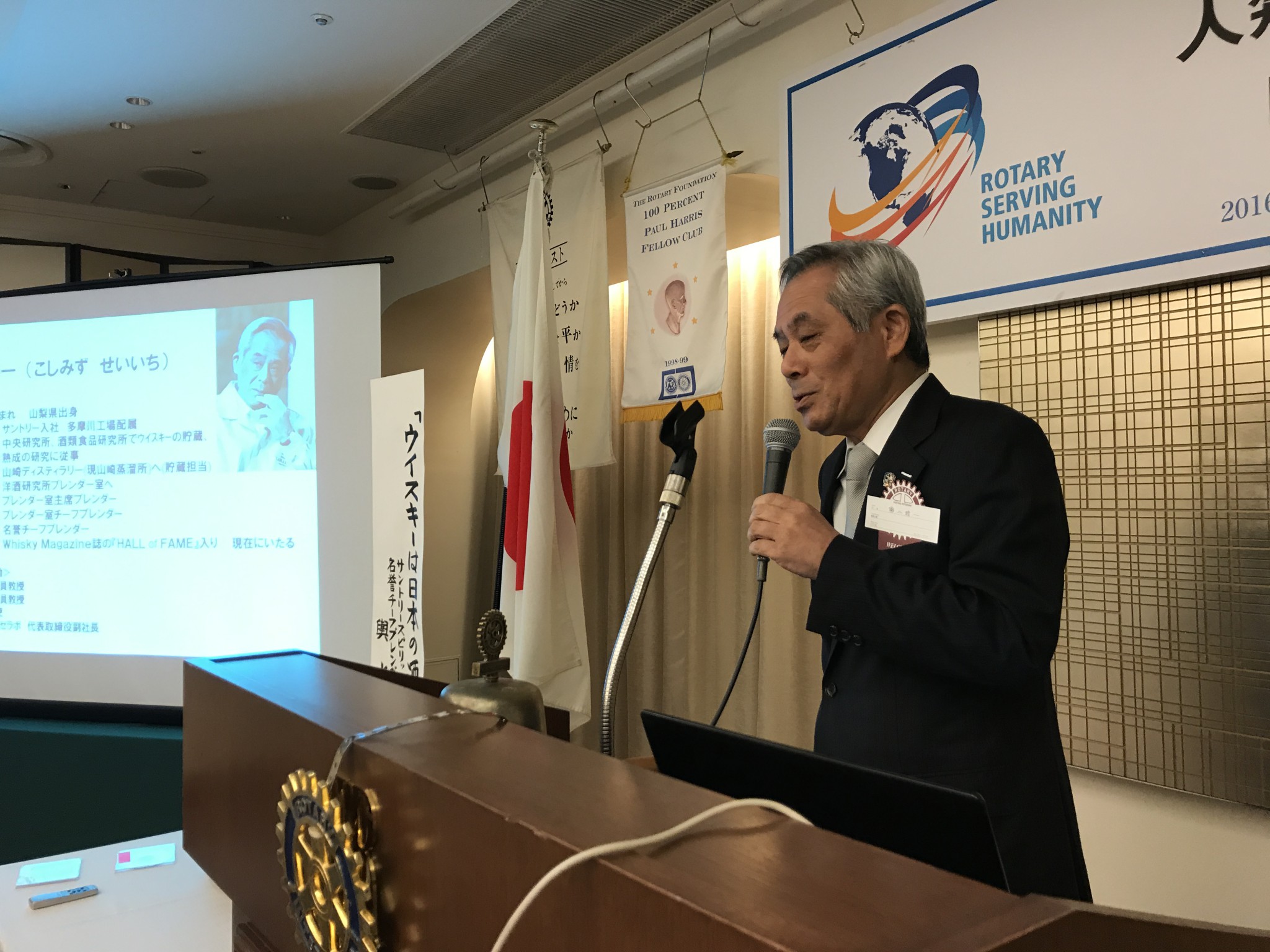 本日の卓話は、【ウイスキーは日本の酒である】というテーマで、サントリースピリッツ株式会社・名誉チーフブレンダー輿水精一氏にお話しいただきました。