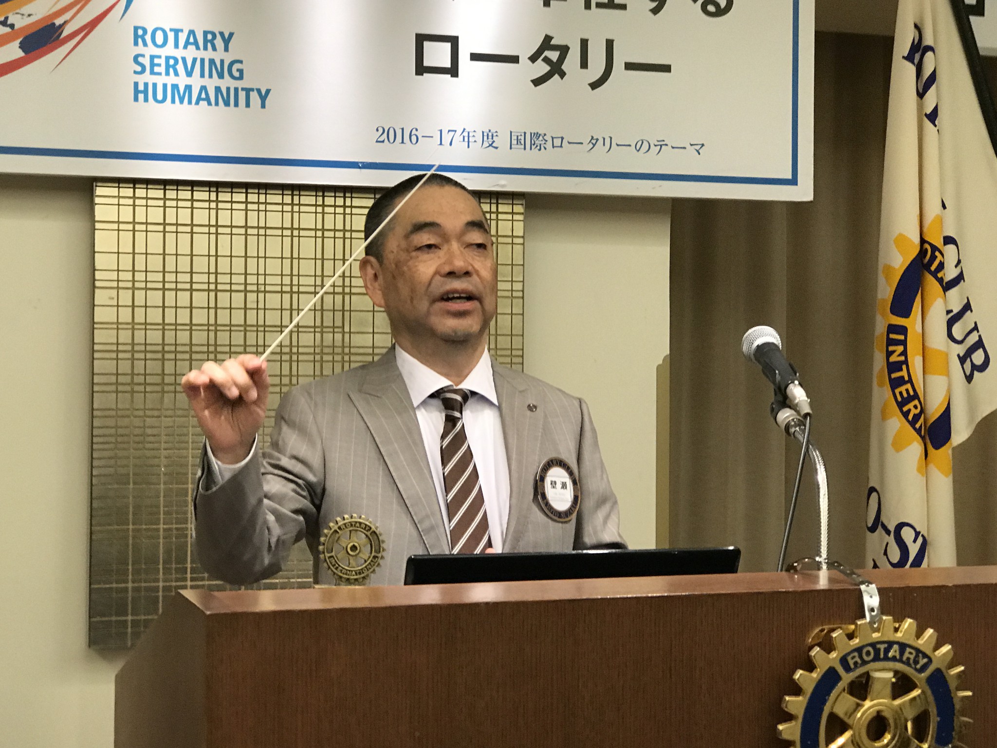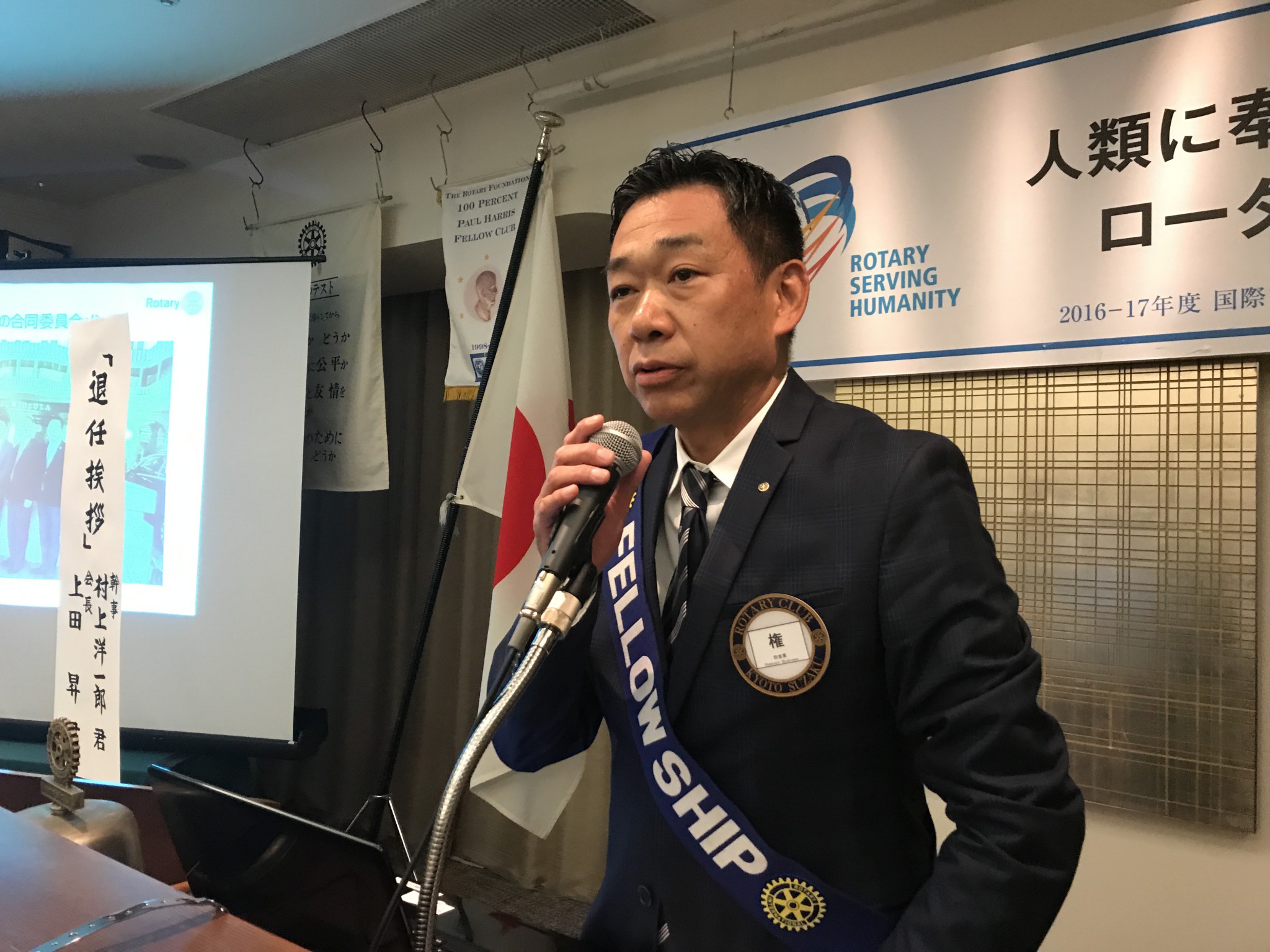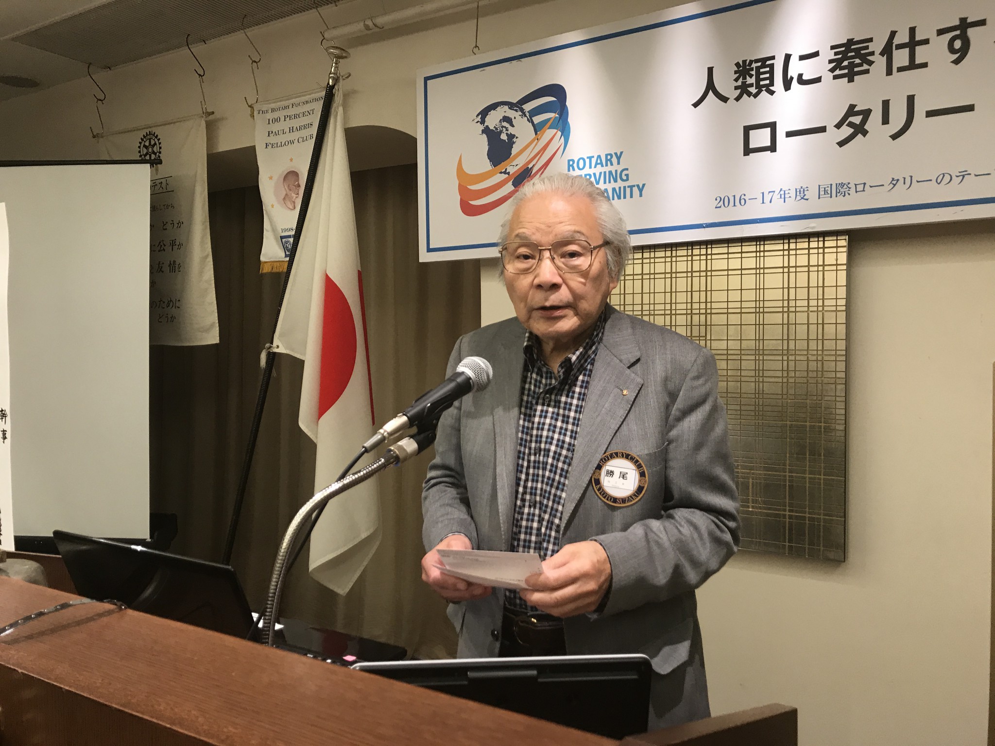 今日は上田会長が体調不良ということもあり、勝尾副会長による開会宣言・開会点鐘から例会が始まりました。