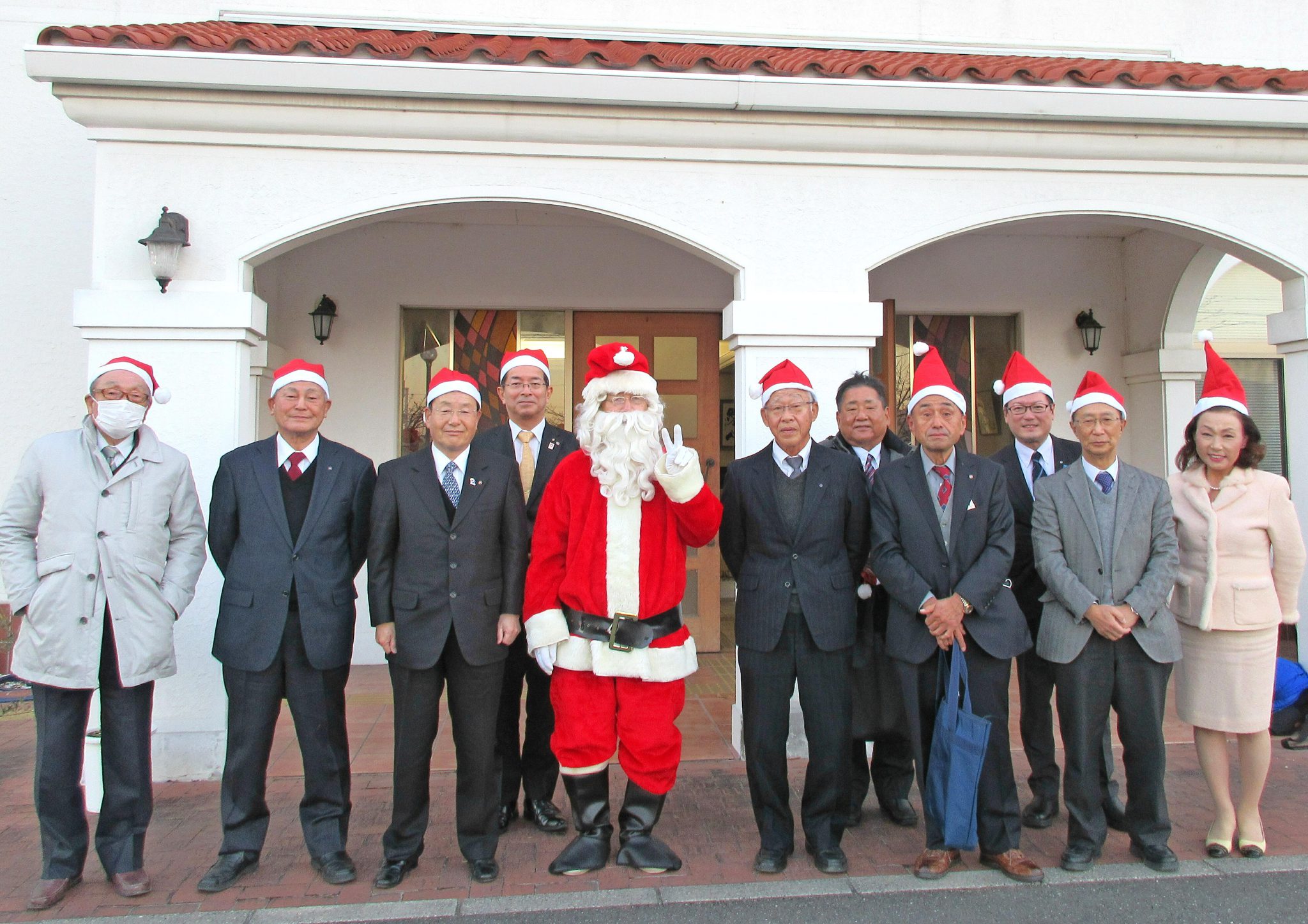 サンタに扮した会員から、入所者全員に文房具とお菓子をプレゼントしました。その後、ソーラー式電波クロックや拡声器、テーブル、チャイルド椅子、歩行器等 施設から要望の高かった品を贈呈しました。そして出し物の発表に移りました。
