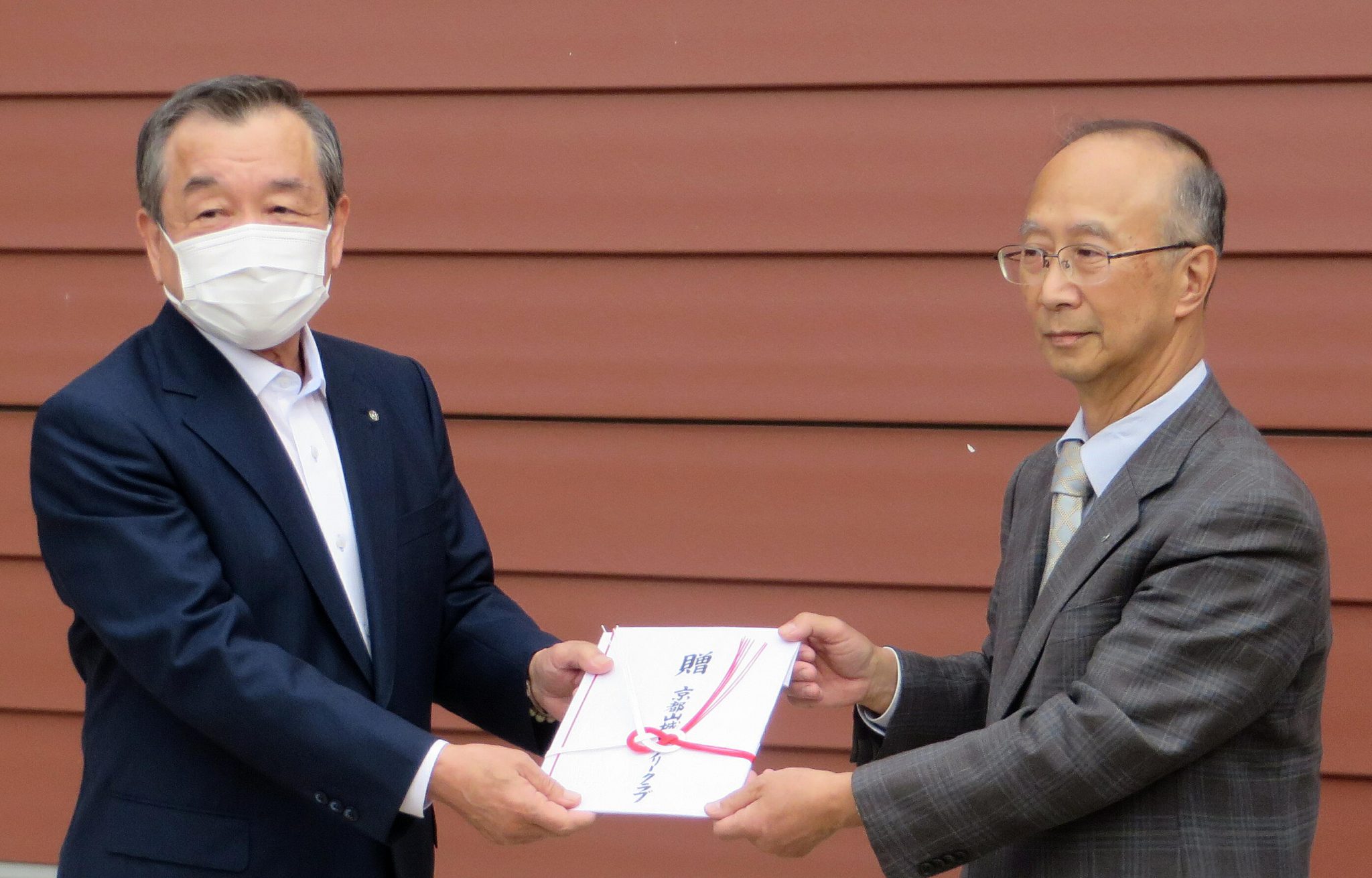 井手町長 汐見明男氏に、岡林会長から目録贈呈