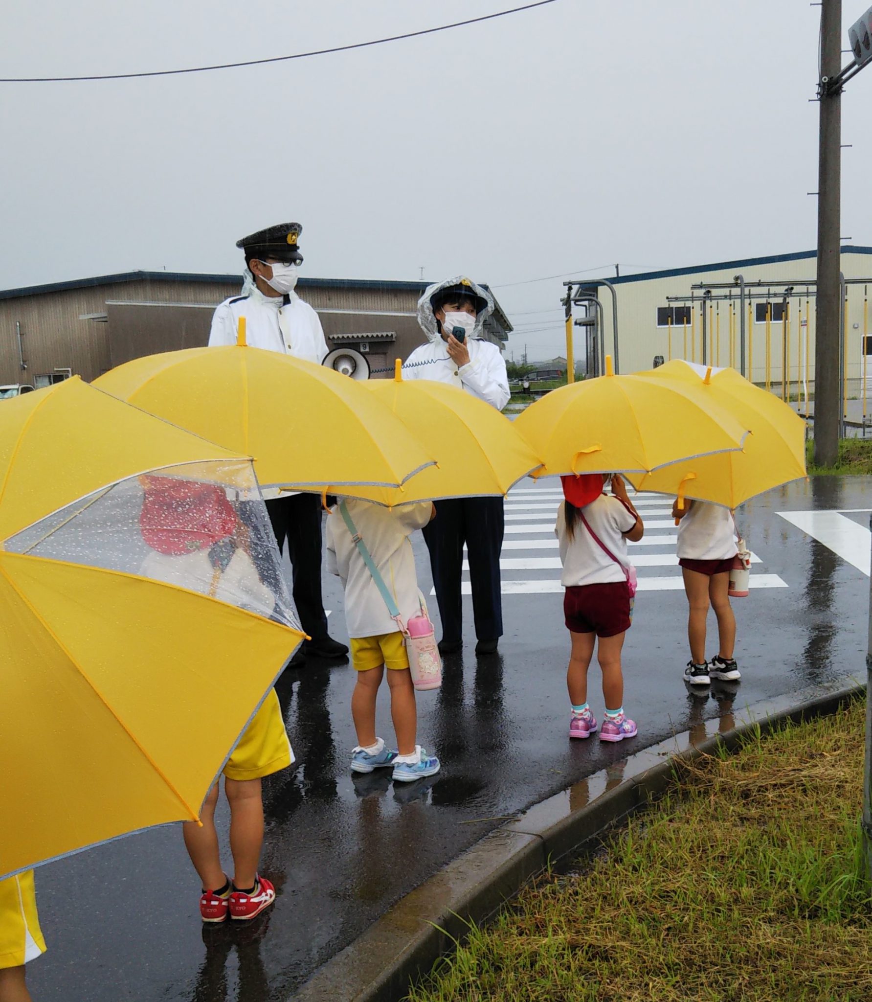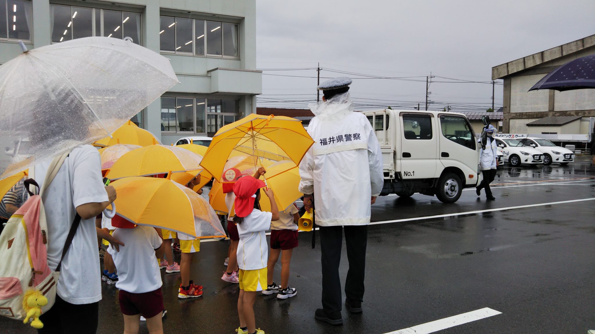 大雨の予報の中、園児対象の交通安全教室を開催しました。園児たちは雨の中、傘を持っての信号機付横断歩道をドライビングスクールのコースを使い警察の方に指導して頂きました。
